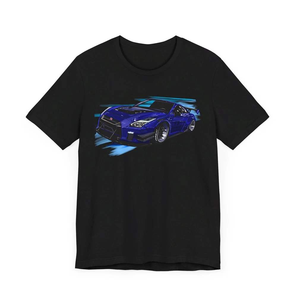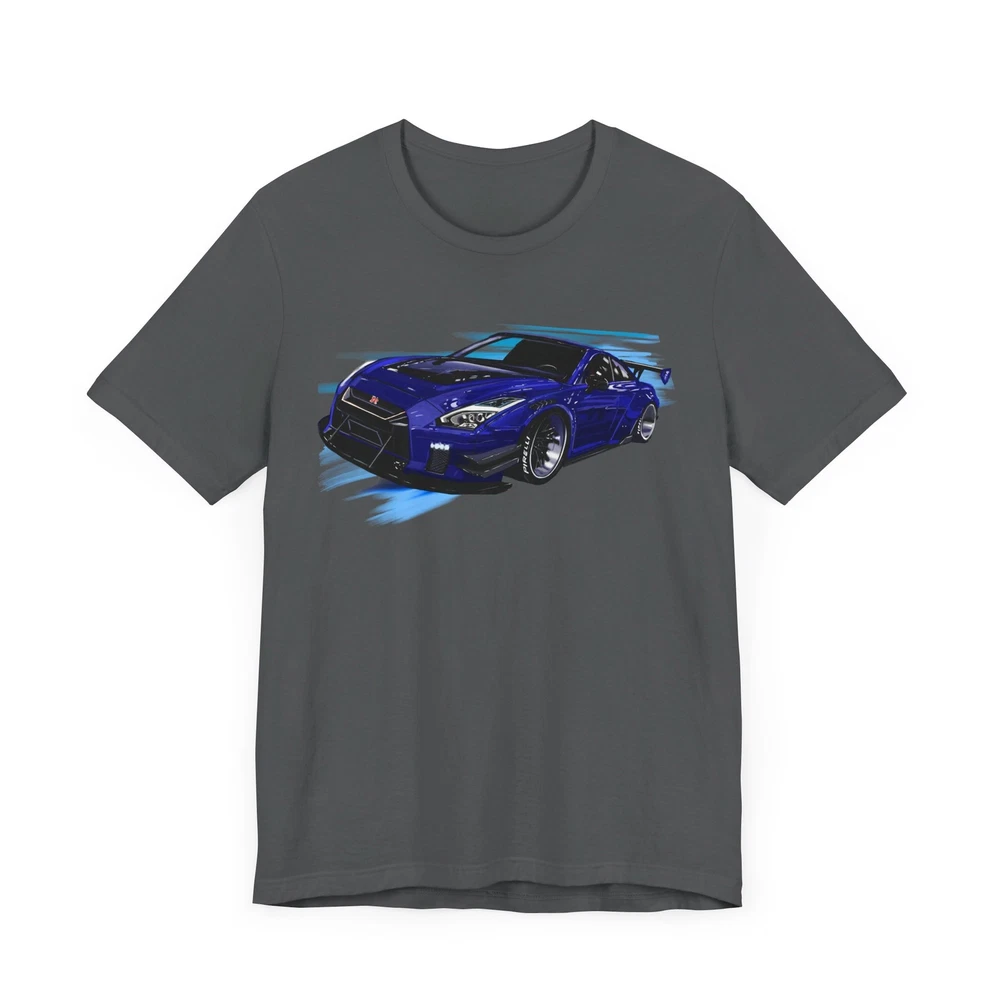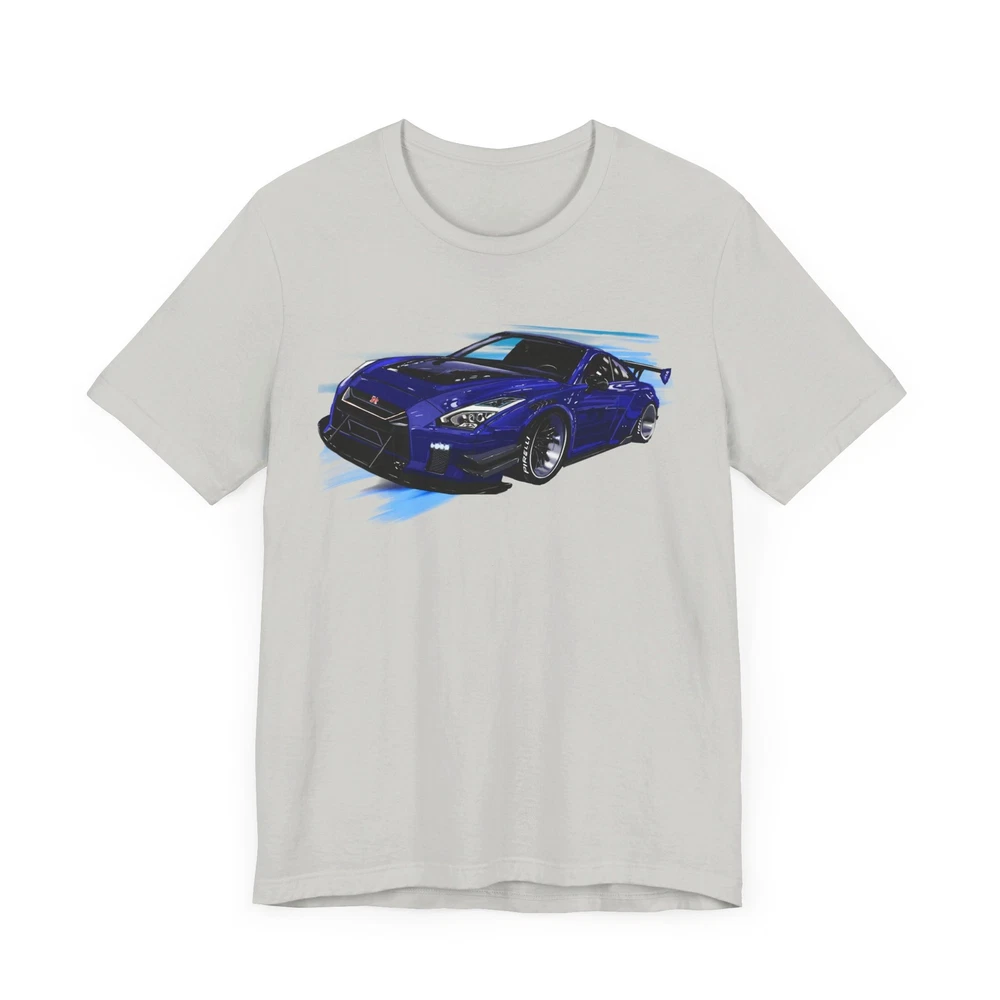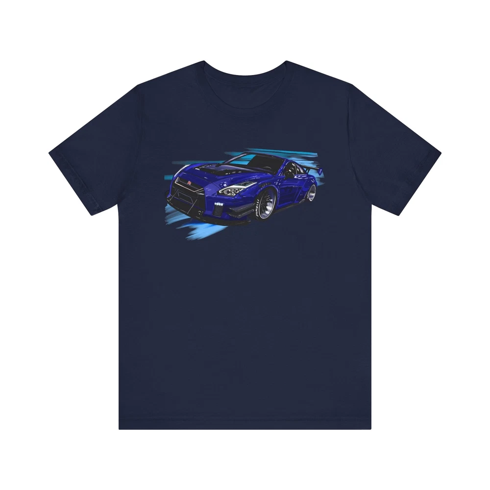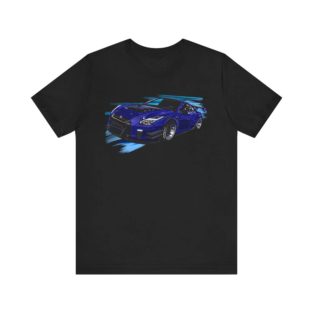 Nissan skyline R35 GT-R Unisex Jersey Short Sleeve Tee made from the artwork by automotive artist Daryl Thompson This classic unisex jersey short sleeve tee fits like a well-loved favorite. Soft cotton and quality print make users fall in love with it over and over again. These t-shirts have-ribbed knit collars to bolster shaping. The shoulders are tapered for a better fit over time. Dual side seams hold the garment's shape for longer. .: Made with 100% Airlume combed and ring-spun cotton, a lightweight fabric (4.2 oz/yd² (142 g/m²)) that is easy to layer, breathable. Perfect for active and leisure wear. .: The retail fit that is perfect for casual and semi-formal settings. The crew neckline adds a classic, neat style that's perfect for accessorizing. .: Bella+Canvas manufactures all its products in the US and internationally in humane, no-sweat-shop, sustainable way and is part of the Fair Labor Association as well as Platinum WRAP certified. .: The tear-away label minimizes skin irritations. .: Fabric blends: Ash and Heather Prism colors - 99% Airlume combed and ring-spun cotton, 1% polyester; Heather colors - 52% cotton, 48% polyester; Athletic Heather and Black Heather - 90% cotton, 10% polyester.
