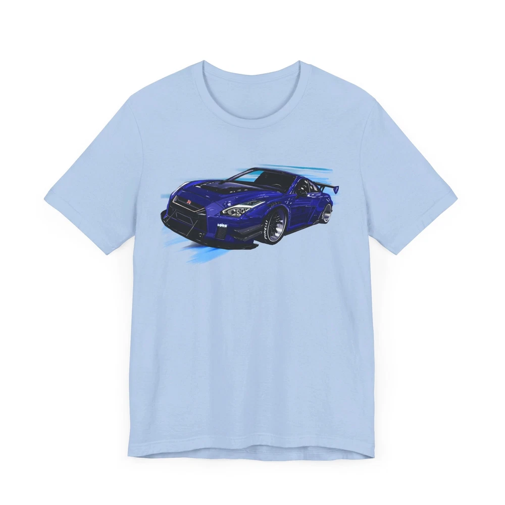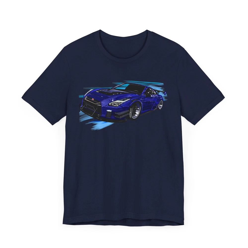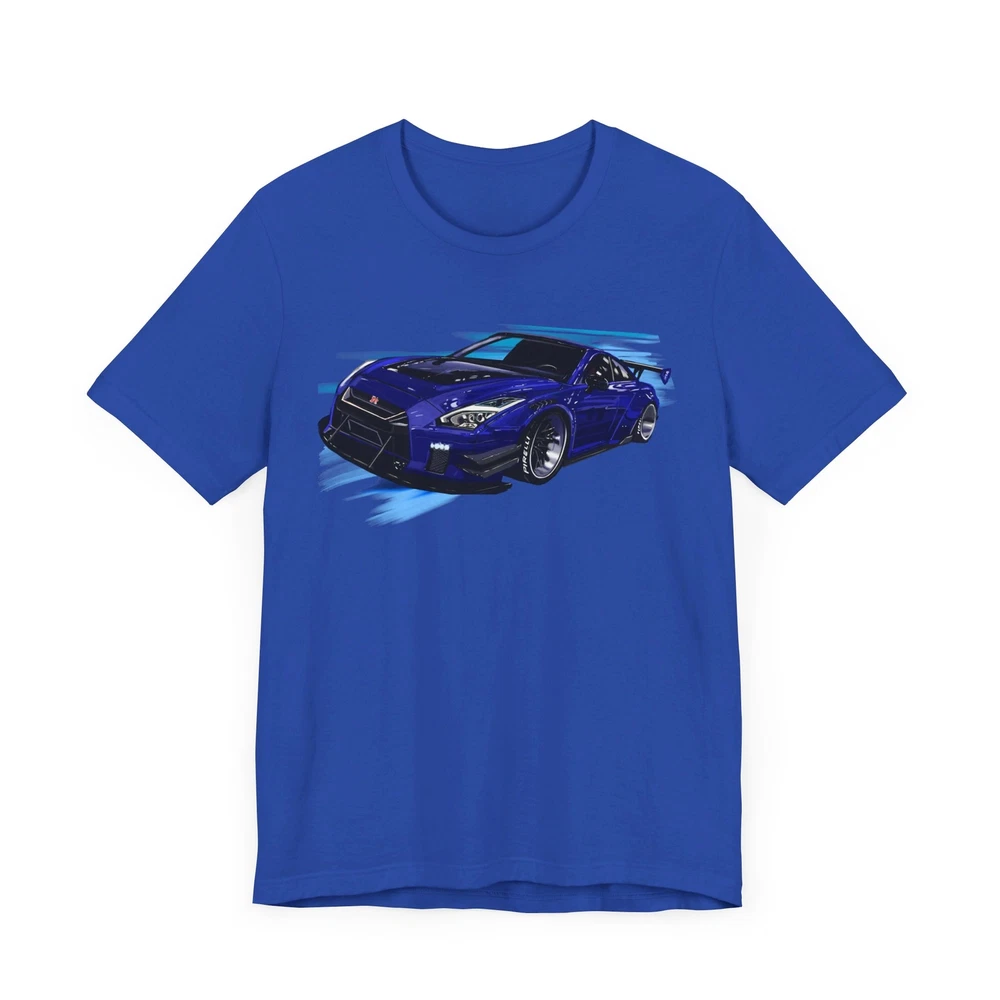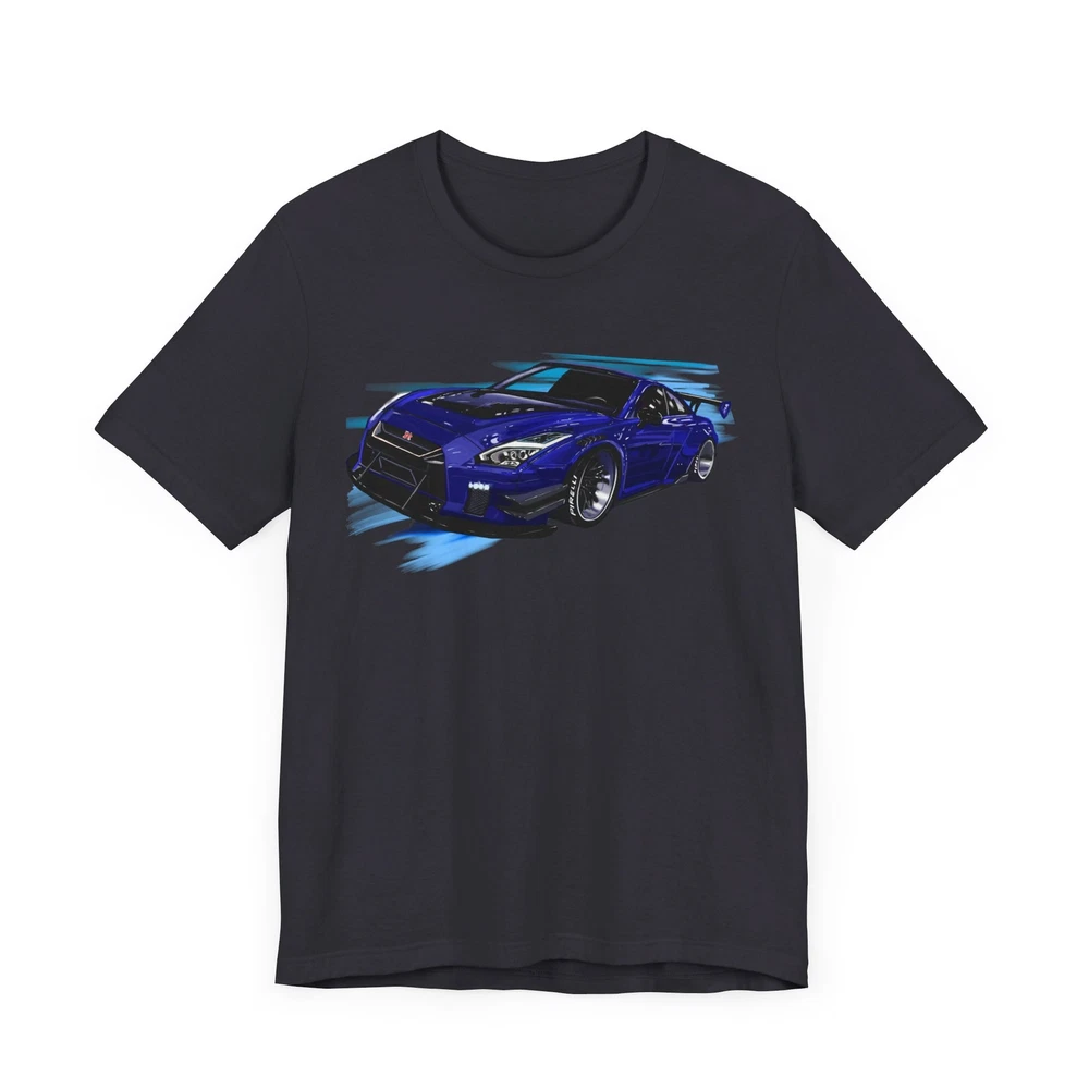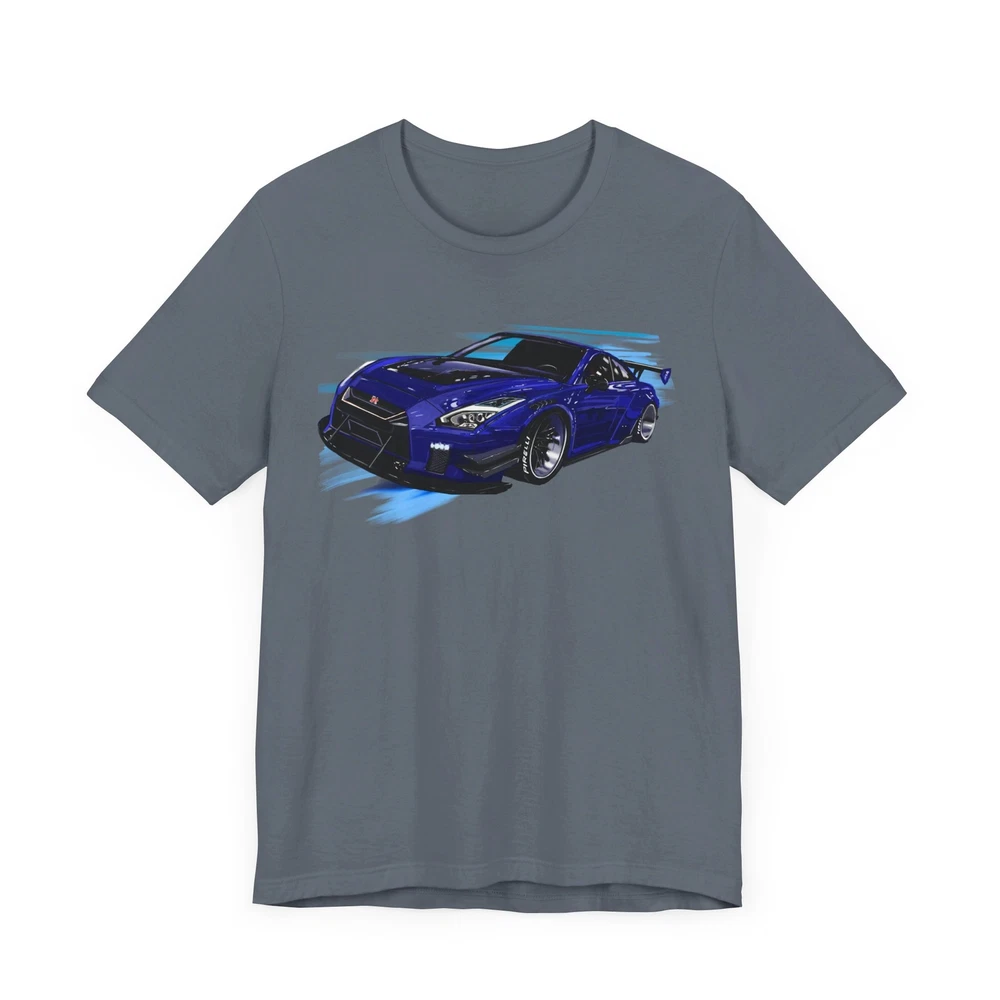 Nissan skyline R35 GT-R Unisex Jersey Short Sleeve Tee made from the artwork by automotive artist Daryl Thompson This classic unisex jersey short sleeve tee fits like a well-loved favorite. Soft cotton and quality print make users fall in love with it over and over again. These t-shirts have-ribbed knit collars to bolster shaping. The shoulders are tapered for a better fit over time. Dual side seams hold the garment's shape for longer. .: Made with 100% Airlume combed and ring-spun cotton, a lightweight fabric (4.2 oz/yd² (142 g/m²)) that is easy to layer, breathable. Perfect for active and leisure wear. .: The retail fit that is perfect for casual and semi-formal settings. The crew neckline adds a classic, neat style that's perfect for accessorizing. .: Bella+Canvas manufactures all its products in the US and internationally in humane, no-sweat-shop, sustainable way and is part of the Fair Labor Association as well as Platinum WRAP certified. .: The tear-away label minimizes skin irritations. .: Fabric blends: Ash and Heather Prism colors - 99% Airlume combed and ring-spun cotton, 1% polyester; Heather colors - 52% cotton, 48% polyester; Athletic Heather and Black Heather - 90% cotton, 10% polyester.