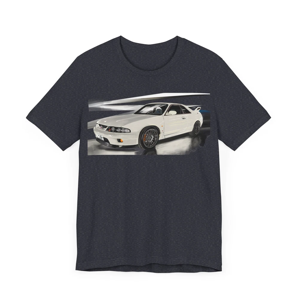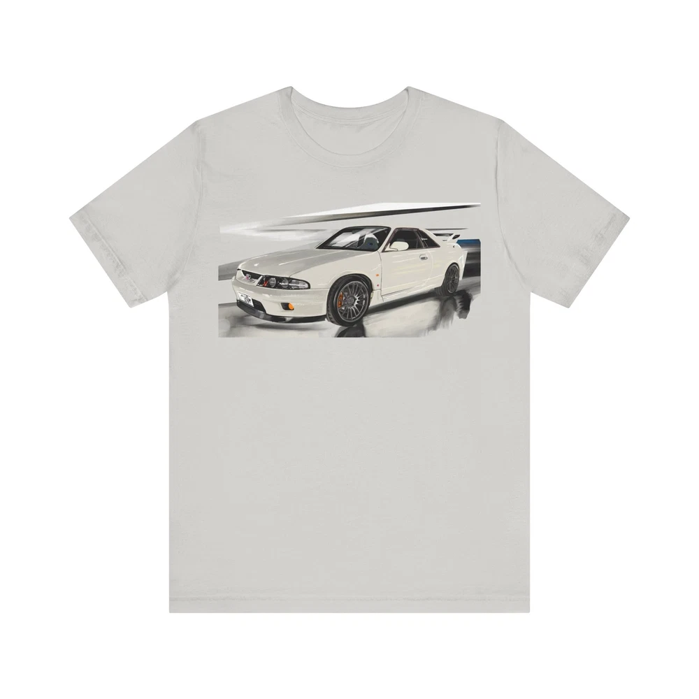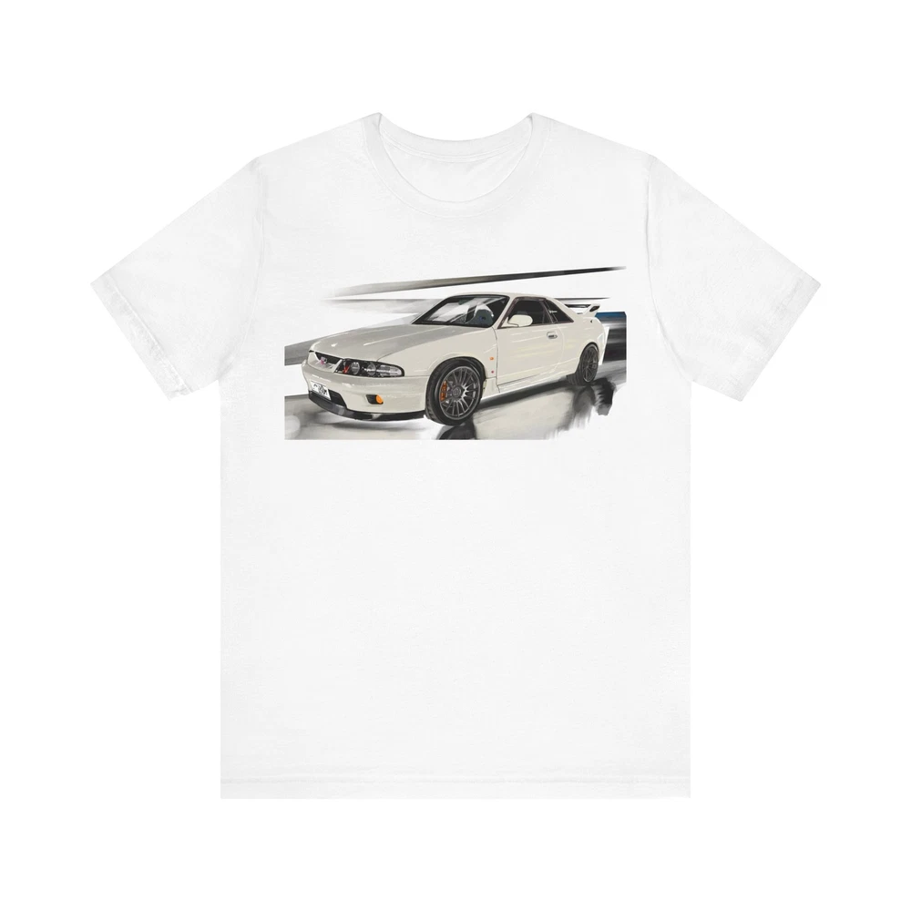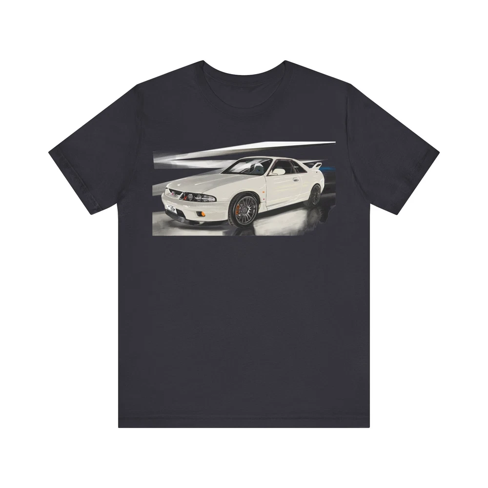 White Nissan skyline R33 GTR Unisex Jersey Short Sleeve Tee made from the artwork by automotive artist Daryl Thompson This classic unisex jersey short sleeve tee fits like a well-loved favorite. Soft cotton and quality print make users fall in love with it over and over again. These t-shirts have-ribbed knit collars to bolster shaping. The shoulders are tapered for a better fit over time. Dual side seams hold the garment's shape for longer. .: Made with 100% Airlume combed and ring-spun cotton, a lightweight fabric (4.2 oz/yd² (142 g/m²)) that is easy to layer, breathable. Perfect for active and leisure wear. .: The retail fit that is perfect for casual and semi-formal settings. The crew neckline adds a classic, neat style that's perfect for accessorizing. .: Bella+Canvas manufactures all its products in the US and internationally in humane, no-sweat-shop, sustainable way and is part of the Fair Labor Association as well as Platinum WRAP certified. .: The tear-away label minimizes skin irritations. .: Fabric blends: Ash and Heather Prism colors - 99% Airlume combed and ring-spun cotton, 1% polyester; Heather colors - 52% cotton, 48% polyester; Athletic Heather and Black Heather - 90% cotton, 10% polyester.