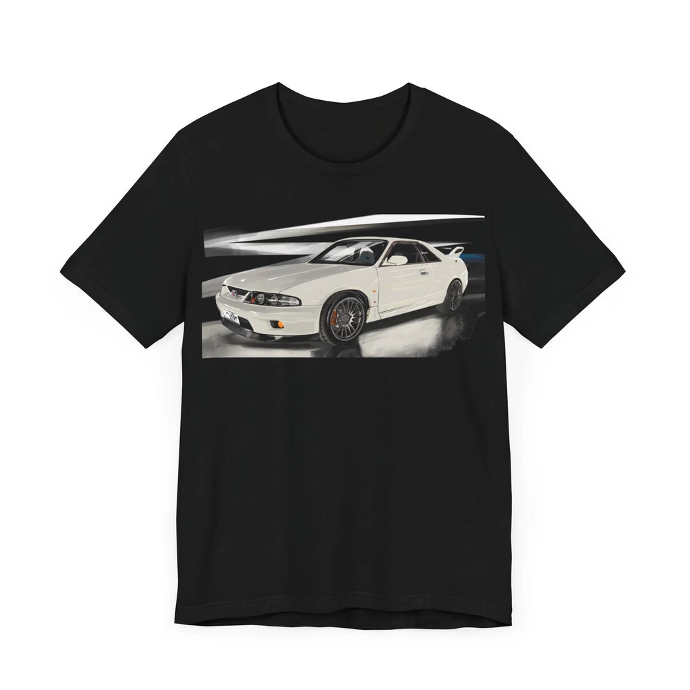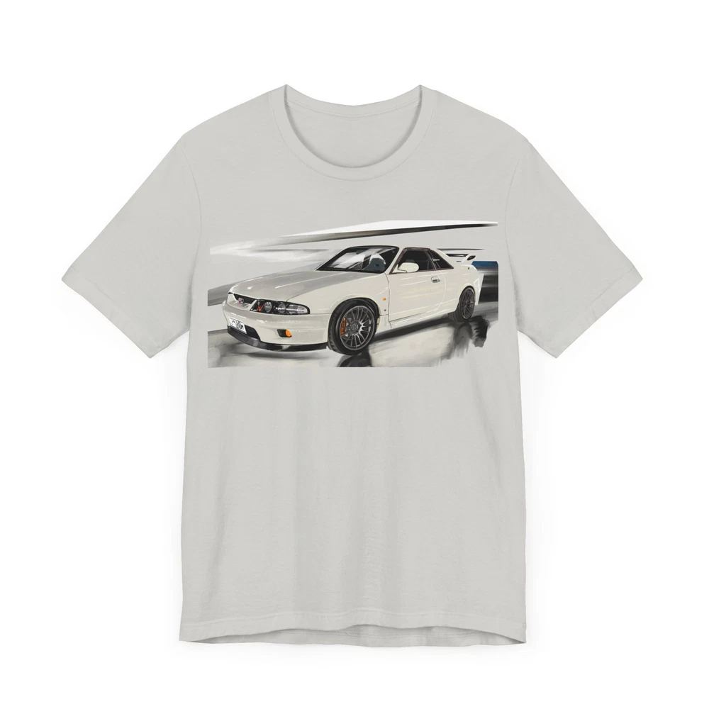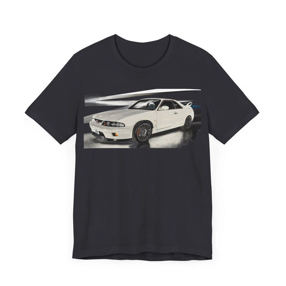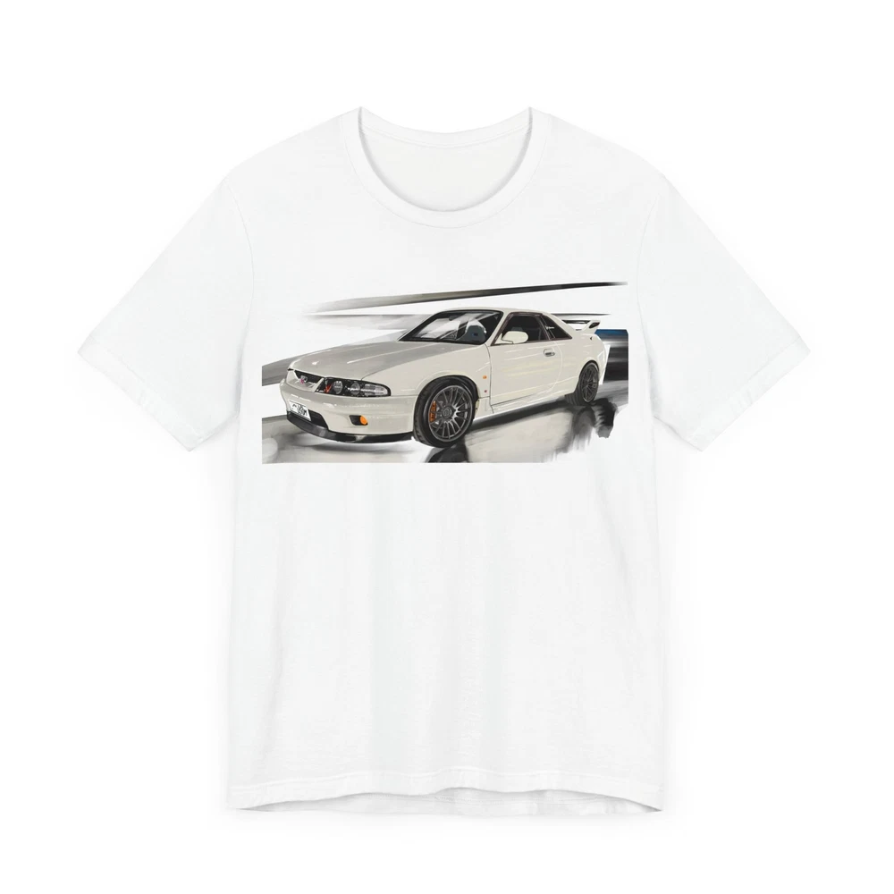 White Nissan skyline R33 GTR Unisex Jersey Short Sleeve Tee made from the artwork by automotive artist Daryl Thompson This classic unisex jersey short sleeve tee fits like a well-loved favorite. Soft cotton and quality print make users fall in love with it over and over again. These t-shirts have-ribbed knit collars to bolster shaping. The shoulders are tapered for a better fit over time. Dual side seams hold the garment's shape for longer. .: Made with 100% Airlume combed and ring-spun cotton, a lightweight fabric (4.2 oz/yd² (142 g/m²)) that is easy to layer, breathable. Perfect for active and leisure wear. .: The retail fit that is perfect for casual and semi-formal settings. The crew neckline adds a classic, neat style that's perfect for accessorizing. .: Bella+Canvas manufactures all its products in the US and internationally in humane, no-sweat-shop, sustainable way and is part of the Fair Labor Association as well as Platinum WRAP certified. .: The tear-away label minimizes skin irritations. .: Fabric blends: Ash and Heather Prism colors - 99% Airlume combed and ring-spun cotton, 1% polyester; Heather colors - 52% cotton, 48% polyester; Athletic Heather and Black Heather - 90% cotton, 10% polyester.