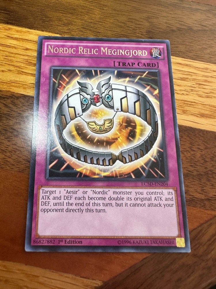 Hello! You are buying one Nordic Relic Megingjord LC5D-EN204 1st Edition Rare in lightly played condition! Reason for lightly played condition is minor general play/scratchwear, mostly on back. See photos for details! As a thank you for buying from me, I will throw in two free Yugioh commons! Thank you so much for looking, have a great day! If there is ever an issue, please let me know so I can do whatever I can to resolve it! Please check out my other items! I have many more single cards!