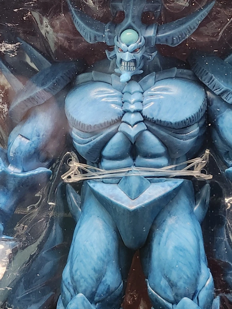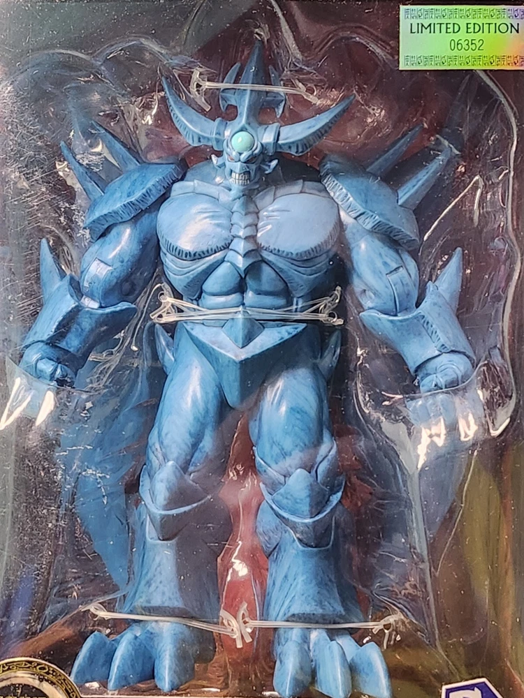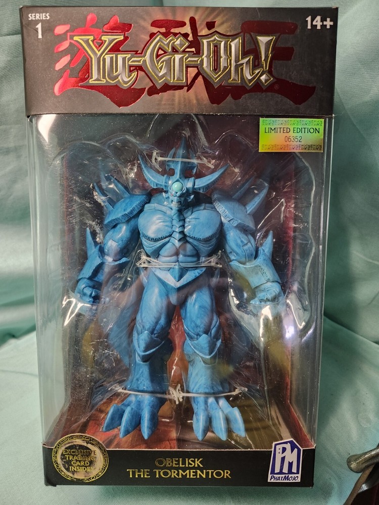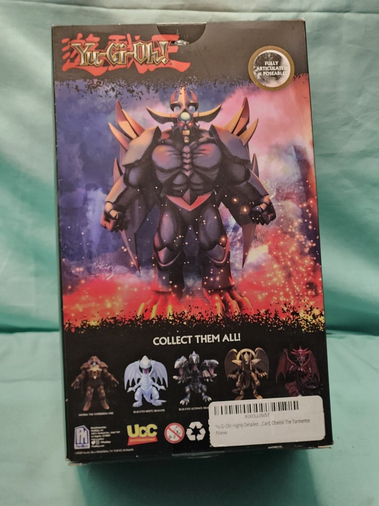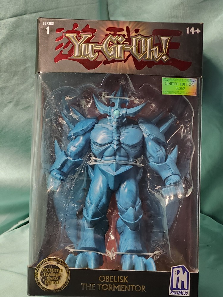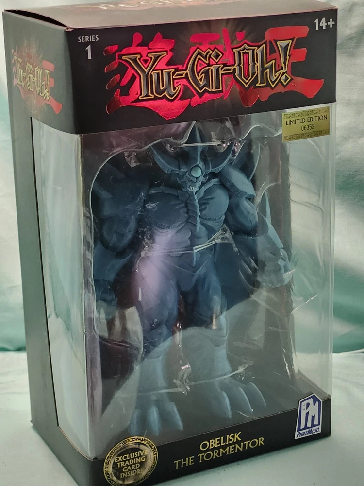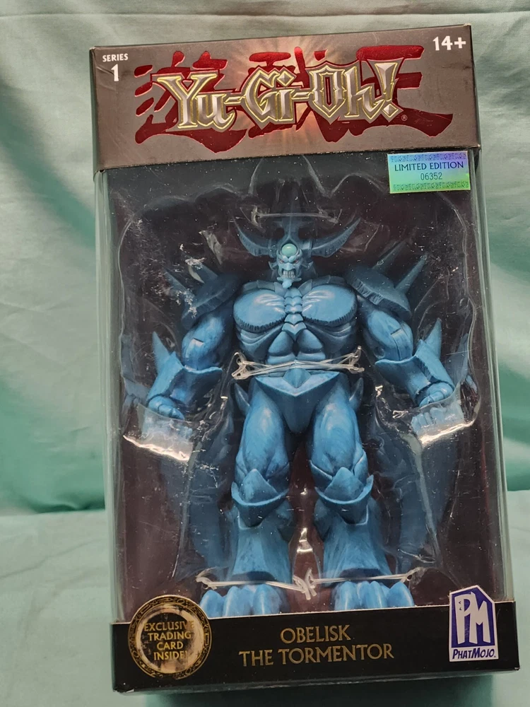 Phatmojo presents the limited edition 7" fully articulated deluxe action figure of Obelisk the Tormentor from the popular Yu-Gi-Oh! franchise. This high-quality plastic model is based on the animation studio Dice's design and features an exclusive card. The figure is in blue color and has a scale of 1:10. It is suitable for age level 14+. The model is fully articulated and it was manufactured in 2020 in the United States by phatMojo. This original and officially licensed product is perfect for any Yu-Gi-Oh! fan and collector. It's new in box with exclusive card and will stay that way for the buyer. Box is good plastic cover has a spot just a smudge. Its new stays new. 22 articulate moves Please look at the photos. Thanks for looking and have a great day 🙂
