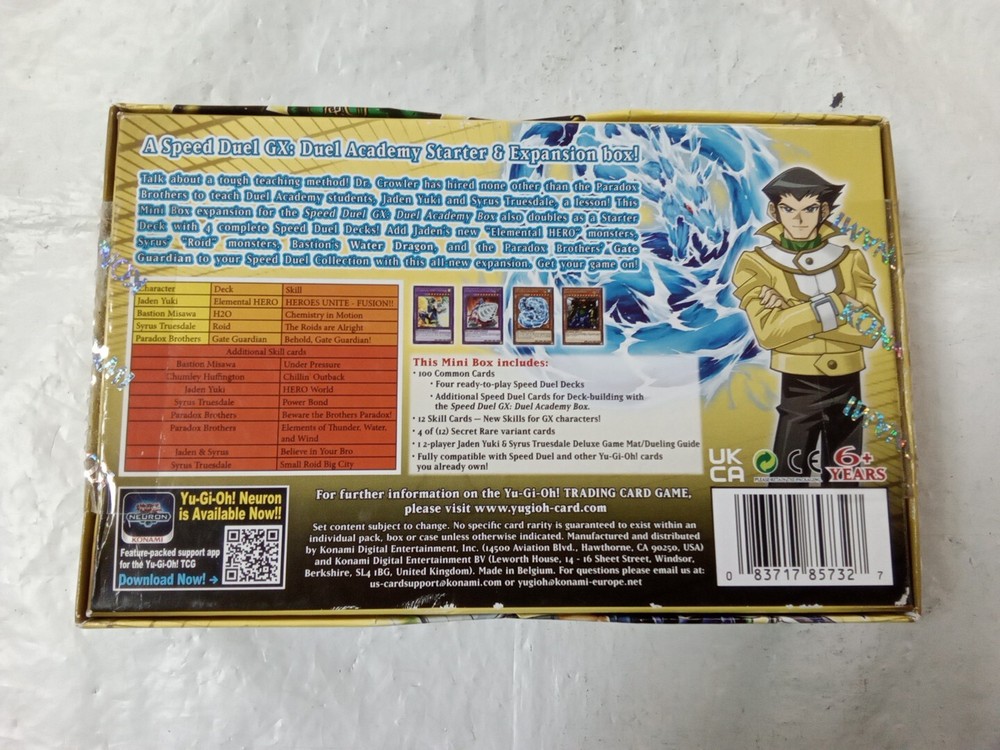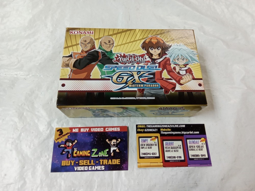 The Yugioh Speed Duel GX Midterm Paradox Mini Box is in pretty good condition and has been cleaned to the best of our ability. As you see in the pictures, the box doesn't have many damages on it, while some card has creases, and most of them are undamaged. Buy with confidence. If you have any questions please contact us. Thank you for your business. Make sure to check out our online store here in Ebay. We upload new inventory on a daily basis. In Arizona? Come visit one of our two retail stores, located in Gilbert and Tempe.