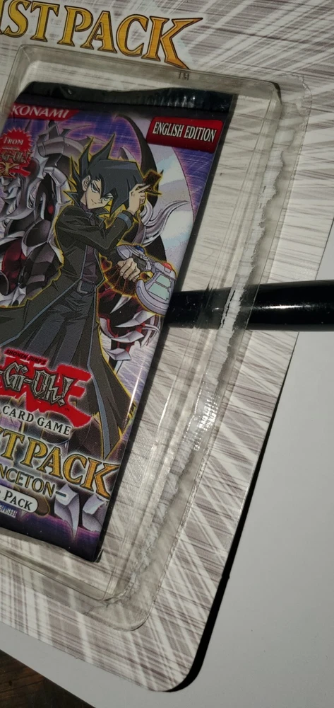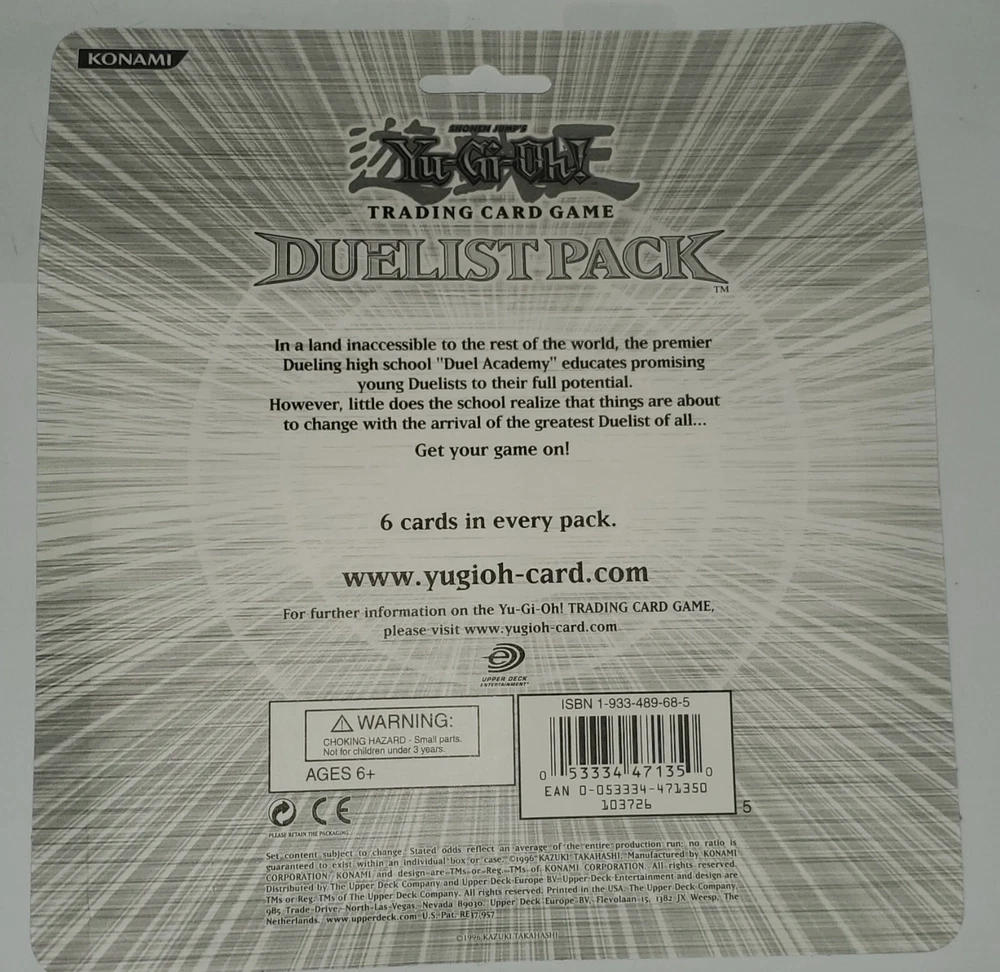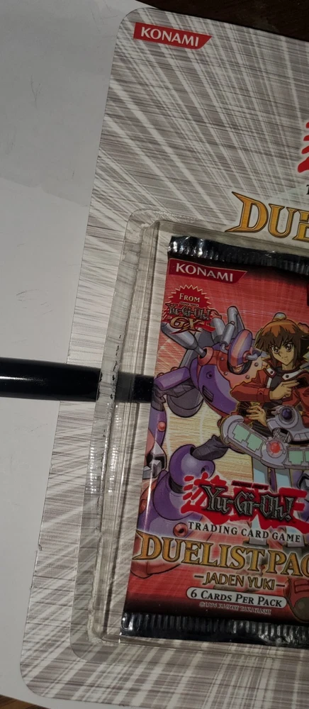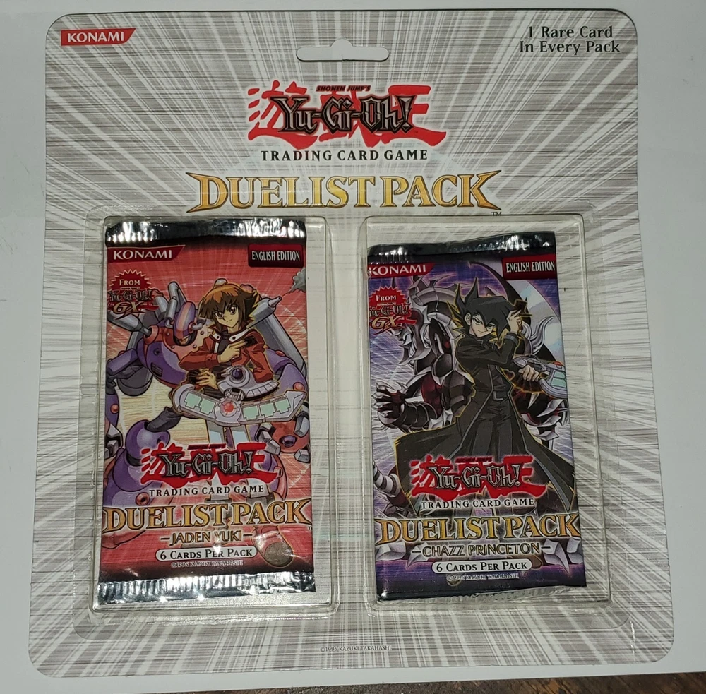 -OPEN- Yugioh GX Chazz/Jaden Duelist Pack Set -NO CARDS- This product has been ---OPENED AND HAS NO CARDS!--- It's just for display or for a collector. I opened it originally and did it cleanly. The outside of each side has been opened along the plastic as shown in pictures. I put a pen through to show. The packs are the packs that were in it originally. The cardboard is bent foreward just above the pack spots, pictured. -- AGAIN, THE PRODUCT HAS BEEN OPENED AND COMES WITH NO CARDS, JUST FOR DISPLAY --