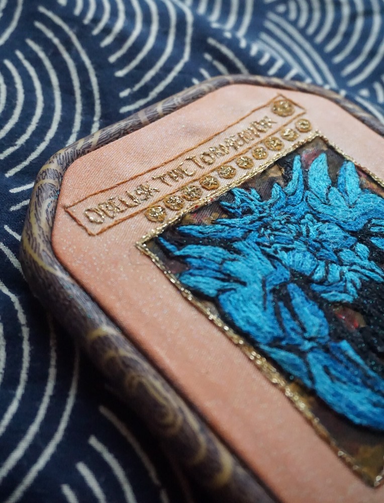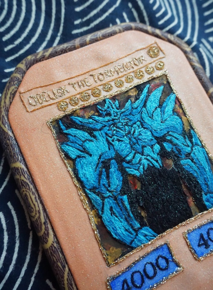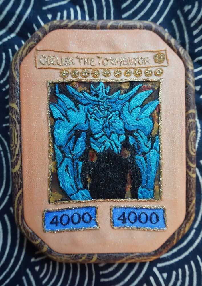 Obelisk The Tormentor From Yu-Gi-Oh, hand-embroidered by me with full color fill and acrylic paint background in a 4x6" resin embroidery hoop....