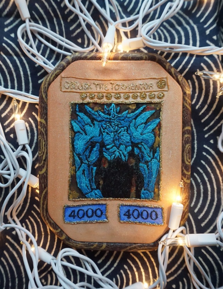 Obelisk The Tormentor From Yu-Gi-Oh, hand-embroidered by me with full color fill and acrylic paint background in a 4x6" resin embroidery hoop.