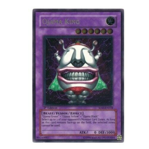 Ojama King (SOD-EN034) - 1st Edition Ultimate Rare - Yugioh *FREE SHIPPING This card is a must-have for any Yu-Gi-Oh! TCG collector. The Ojama King (SOD-EN034) is a Fusion card with an Attack/Power of 0 and a Defense/Toughness of 3000. It is a Beast-type Monster with the speciality of GX. The card is of Ultimate Rare rarity and has a finish that is ultimate. It is from the Soul of the Duelist set and is manufactured by Konami. The card is in excellent condition and is available as an Unlimited 1st Edition. The card name is Ojama King and it is in English. It comes with free shipping, making it an even more attractive purchase for collectors. Don't miss your chance to add this rare and valuable card to your collection.