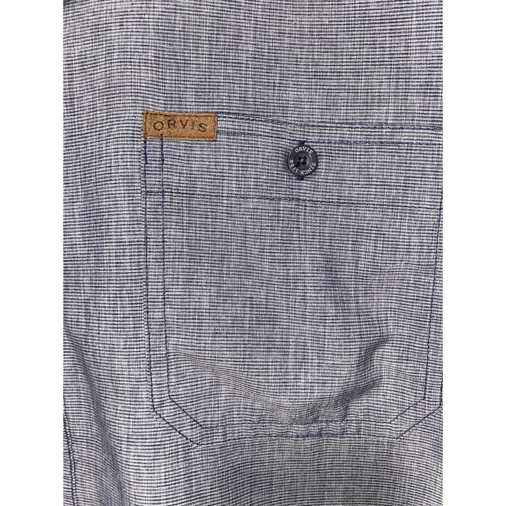 Orvis Shirt Mens XXL Blue Button Up Short Sleeve Pockets Logo Outdoor Casual Measurements Armpit to armpit 28 inches Top to bottom 30 inches Sleeve length 11 inches
