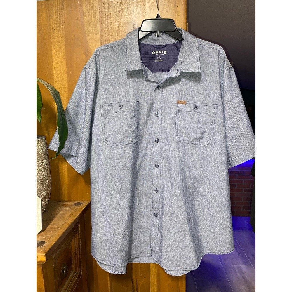Orvis Shirt Mens XXL Blue Button Up Short Sleeve Pockets Logo Outdoor Casual Measurements Armpit to armpit 28 inches Top to bottom 30 inches Sleeve length 11 inches ...