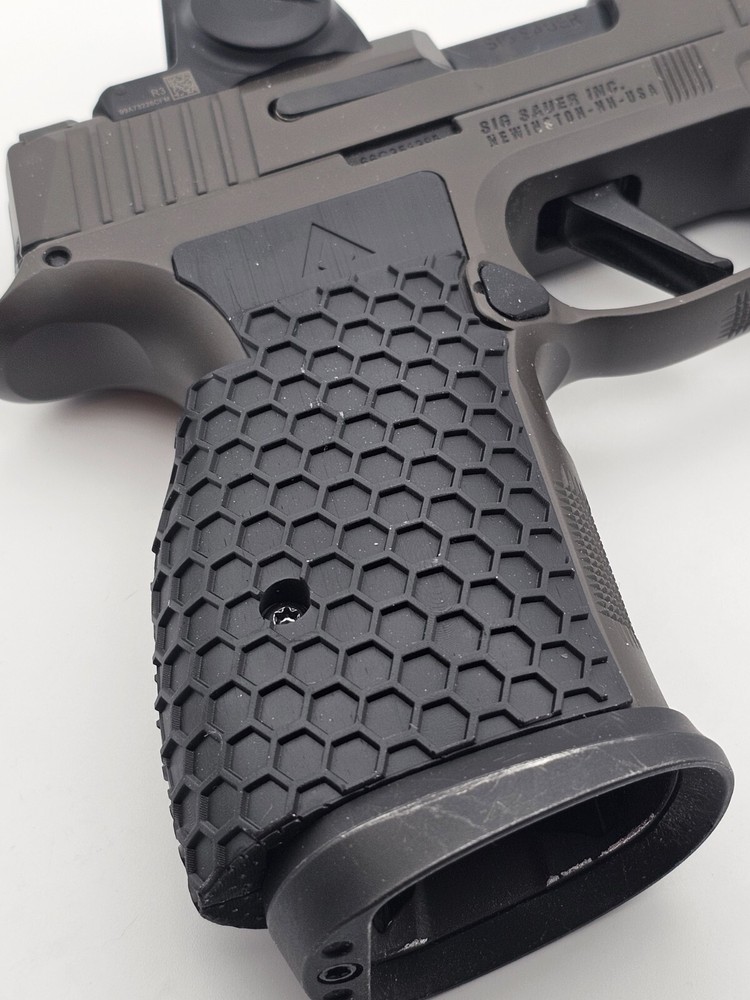 Enhance the grip of your SIG SAUER P365 AXG Legion with these extended heel, wraparound pistol grip panels. These grips are made of durable polymer material, and are thicker than the factory grip panels, ensuring a comfortable and secure hold during use. Designed specifically for the P365 AXG Legion. Made in the United States.