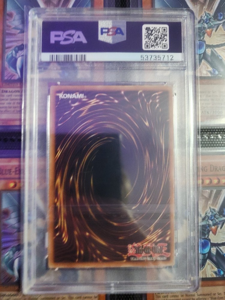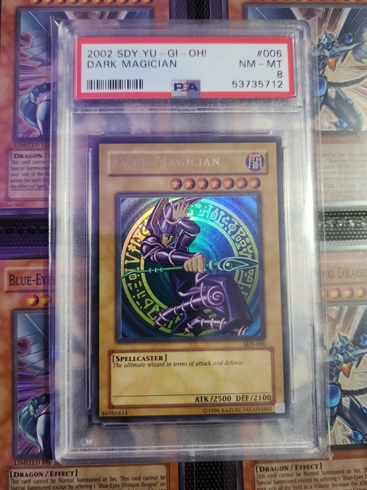 Yugioh PSA 8 Dark Magician 2002 Starter Deck Yugi SDY-006 AI description: This Ultra Rare, Holo Dark Magician card from the 2002 Yugi starter deck is a must-have for any Yu-Gi-Oh! TCG collector. The card features Seto Kaiba's iconic character and is made of durable card stock. This English language card has been professionally graded as PSA 8 and is unlimited edition, meaning it can be used in any game. The card size is Japanese and it was manufactured by Konami in the United States. It belongs to the Yugi set and is a great addition to any collection for players aged 6 and up. Its finish is holo and its rarity adds to its value. Add this Dark Magician card to your collection today!