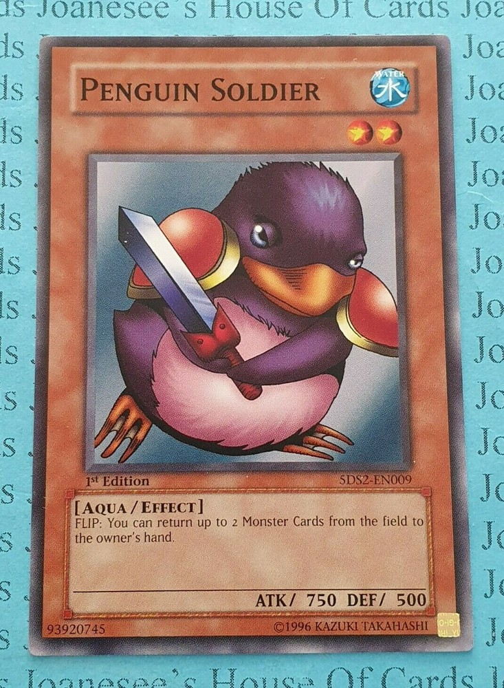 This is a Common Water Aqua Penguin Soldier 2 Stars ATK/750 DEF/500 Card text: FLIP: You can target up to 2 monsters on the field; return those targets to the hand. 5DS2 -EN009 1st Edition English Mint/NMint Condition Totally Original Konami (or your money back!) I will deliver in safe packaging to keep it in perfect condition. Ideal for players and collectors alike. Check out my other items! I will combine postage costs for multiple purchases. Sign up for my email newsletters by adding my eBay Shop to your favourites