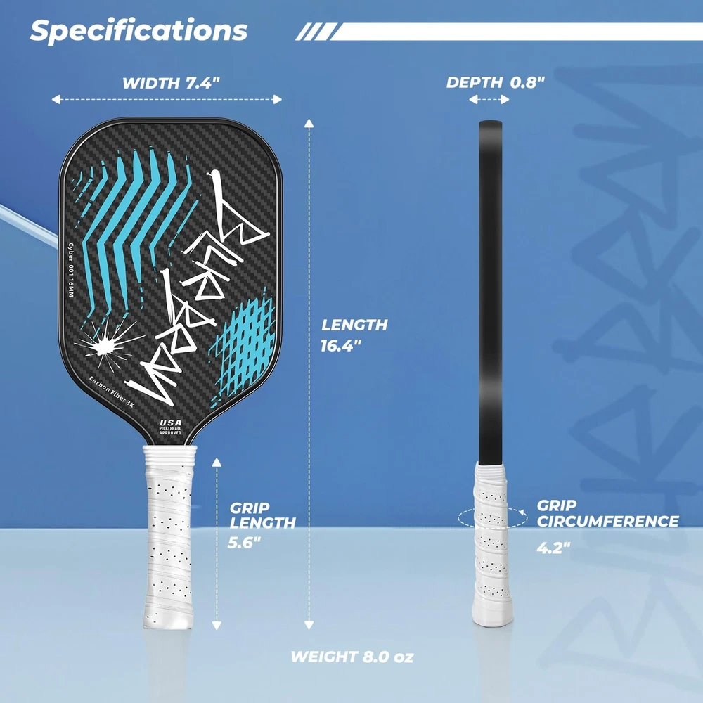 The Cyber 001 3K+ T700 carbon fiber pickleball paddle combines optimized design with cutting-edge materials and innovative structure, elevating your pickleball game to the next level. 【Cutting Edge Carboon Grit Paddle Face】Advanced Carbon Grit Paddle Face Material: 2 layers of T700 and 1 layer of 3K for high strength, hardness and density to consistently provide durability, high rebound force, high friction coefficient and power. 【Lightweight 16MM Polyprolypene Honeycomb Core】Reduced pressure on wrist and elbows to enhance consistency of play and control for extended periods due to a 16mm lightweight polypropylene honeycomb core facilitating optimal shock absorption. 【Blue Bean High Performance Grip】Premium synthetic leather, breathable anti-slip holes and super comfortable grip, thereby reducing fatigue during prolonged use. 【Professional Bat Size】The Blue Bean Cyber 001 Carbon Fiber Pickleball Paddle Weight Range:8.0-8.5OZ,Length:16.4",Width:7.4",1 layer 3K Raw Carbon Fiber+2 layer T700 Surface,Grip Circumference:4.2",Grip Length:5.6",Core:Polyprolypene Honeycomb Core 【USA Pickleball Approved】carbon fiber pickleball paddles are USAPA approved for tournament play. 【Optimized Design】With its eye-catching cyberpunk design, Cyber carbon fiber pickleball paddle is the wonderful bat to let your opponents know you’re primed and ready to take them on. Not only does the Cyber bat look the part, it’s also the right choice which engineered for Players Intermediate and Above
