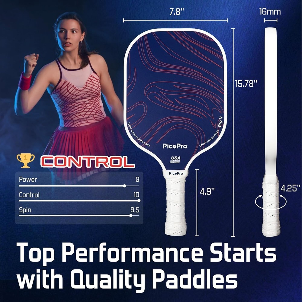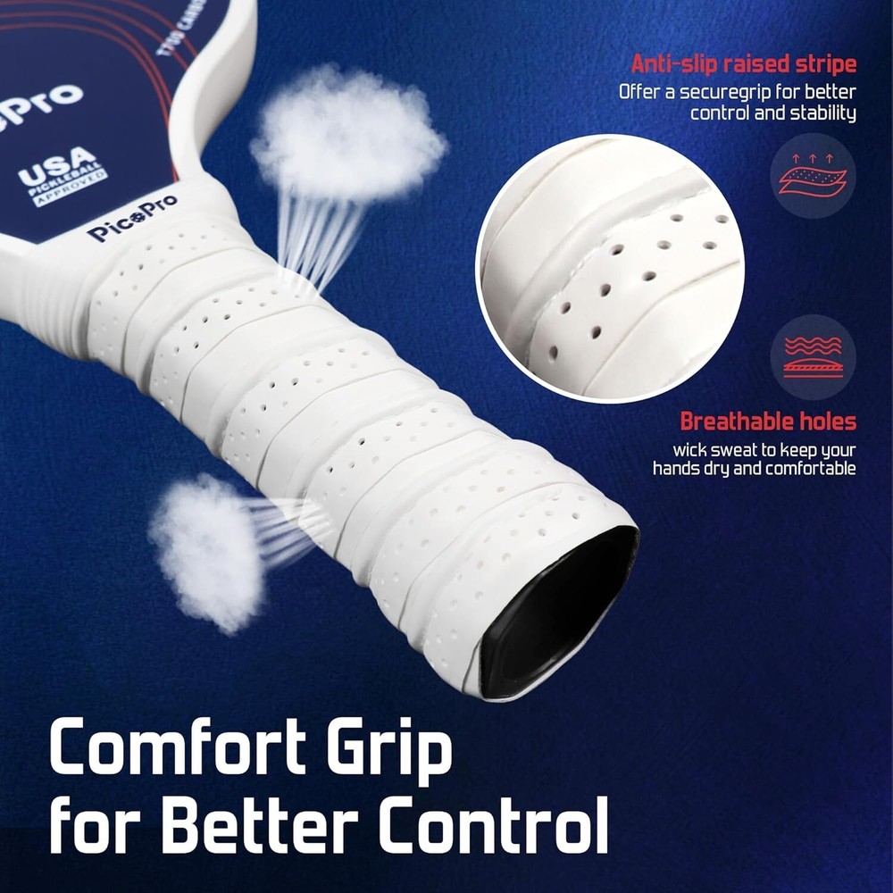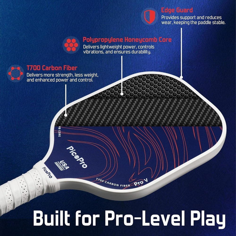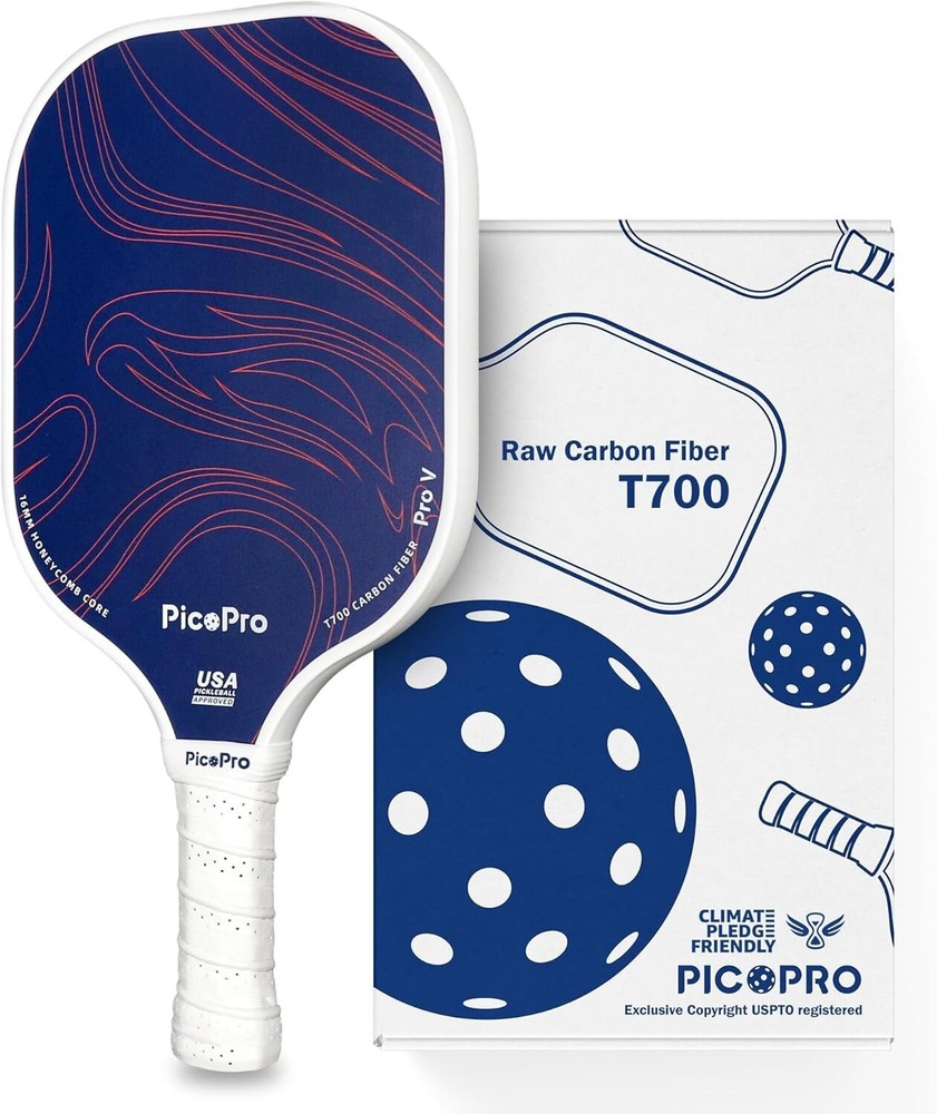 PicoPro Pickleball Paddle T700 Carbon Fiber, Honeycomb Polymer, 16mm Thick Tournament-Ready USAPA-approved T700 carbon fiber paddle meets official standards—perfect for players seeking top-level performance and precision. Premium Spin & Control T700 carbon fiber face provides superior spin, control, and durability for powerful, accurate shots at any skill level. Powerful Precision Core A 16mm polypropylene honeycomb core enhances power, reduces vibrations, and enlarges the sweet spot for smooth, consistent play. All-Day Comfort Grip Ergonomic handle with anti-slip, sweat-wicking ventilation keeps hands dry and reduces fatigue, ensuring comfortable extended gameplay. Versatile for All Players Suitable for beginners or pros, at home or in clubs—an ideal gift for anyone passionate about pickleball.