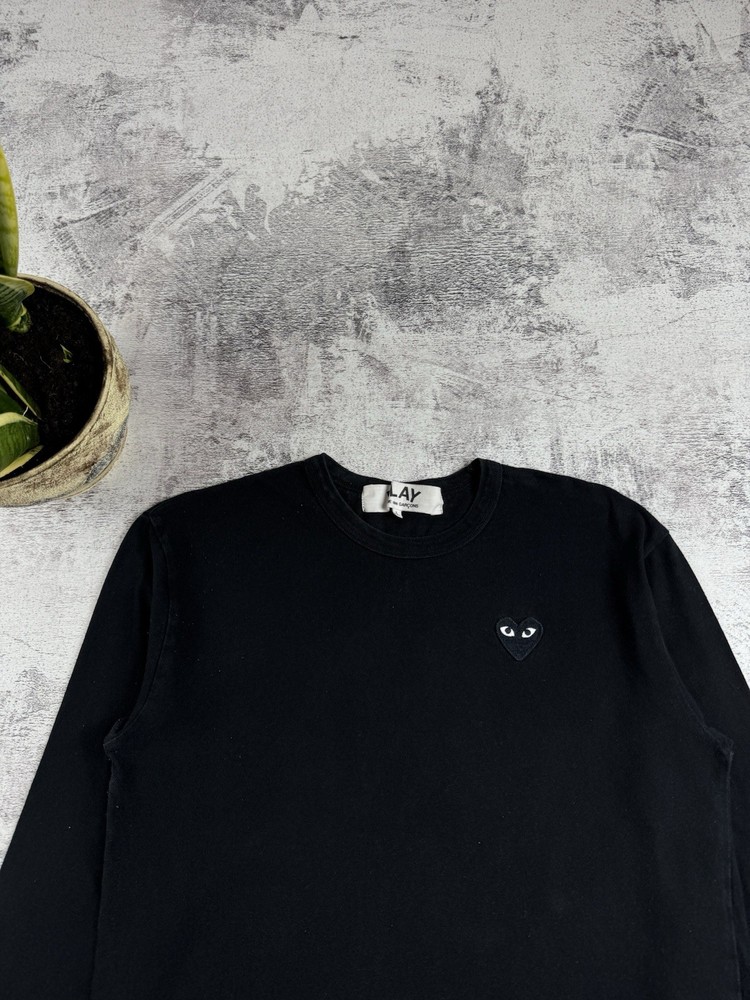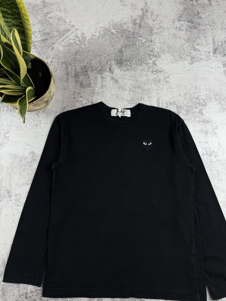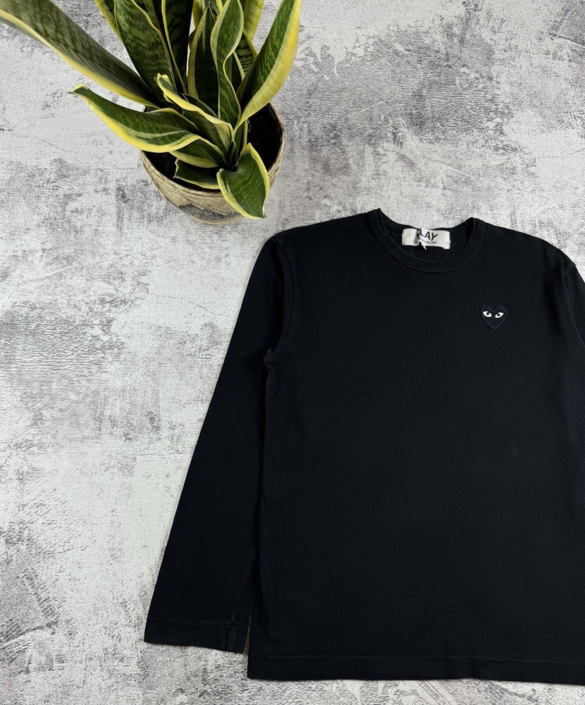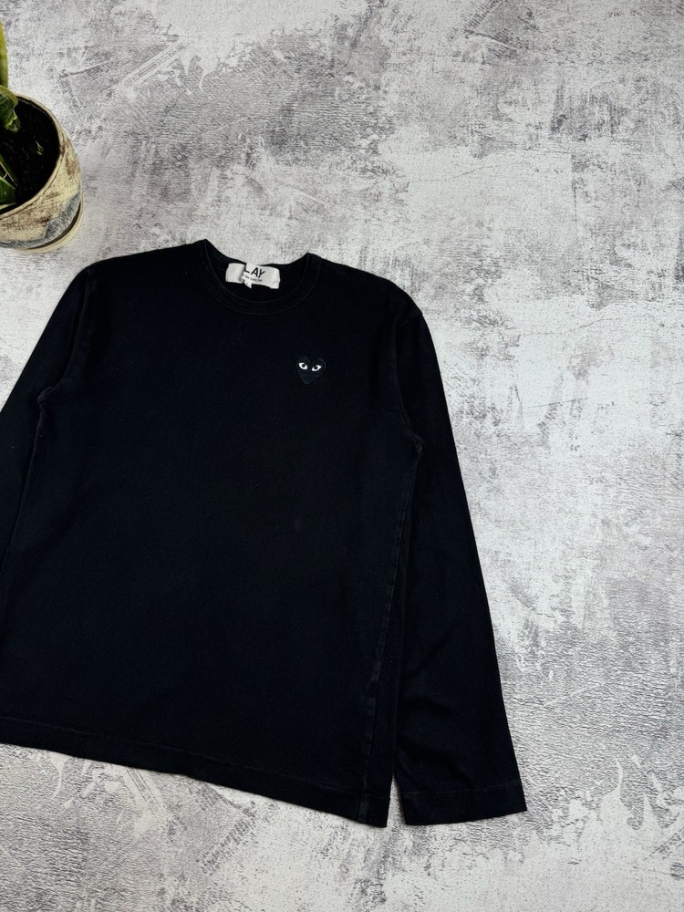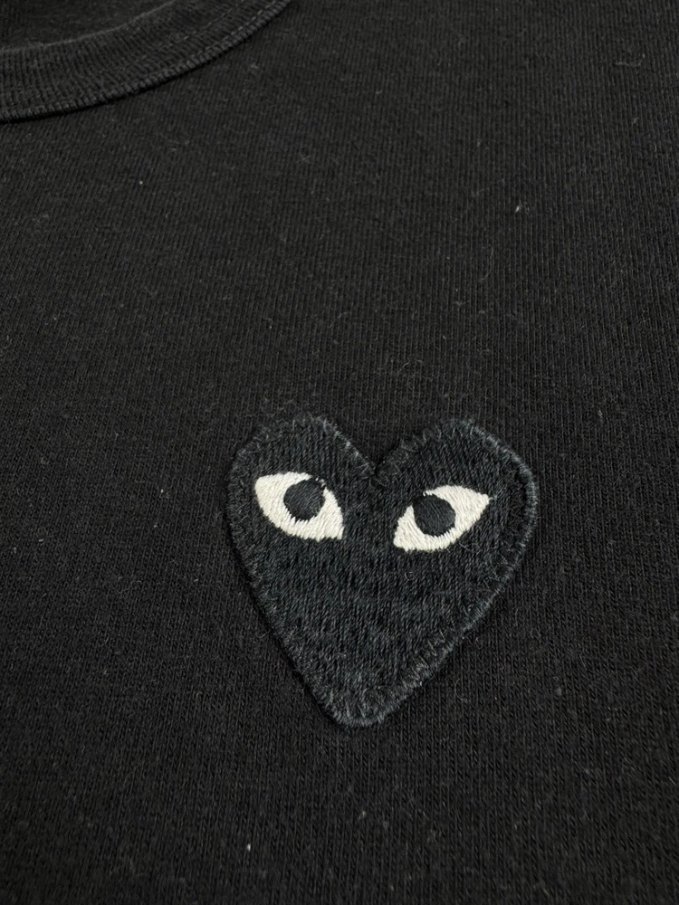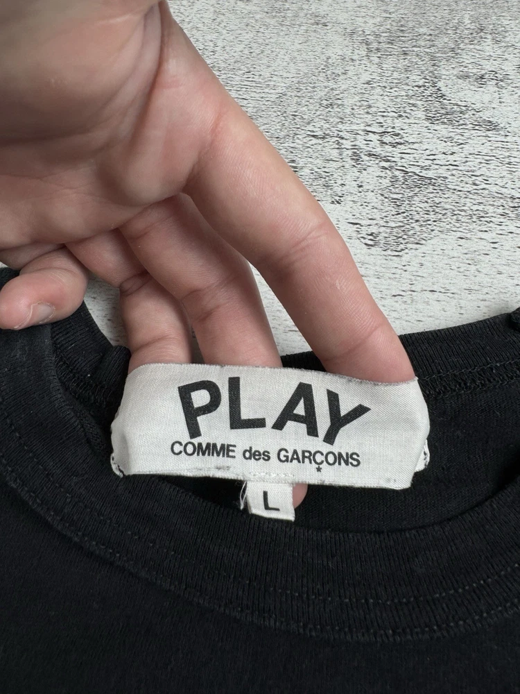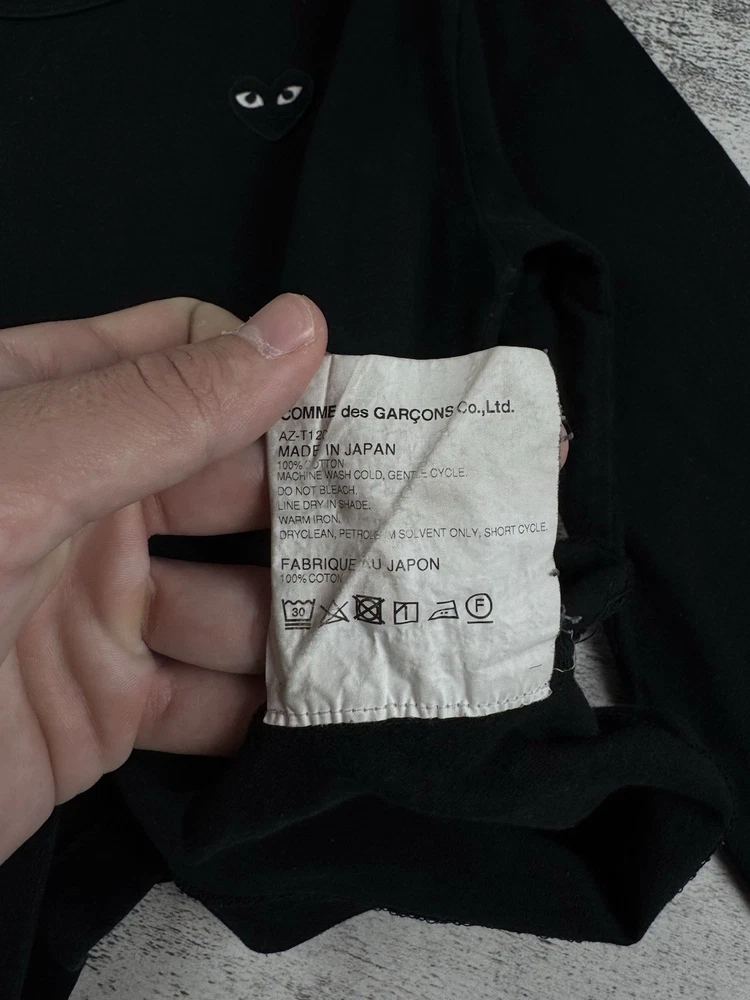This limited edition Play Comme Des Garcons CDG Black Cotton Japanese Jersey Longsleeve T Shirt Tee is a must-have for fashion-forward men. Made in Japan, this t-shirt features a unique graphic print with a variety of characters and accents such as fur trim, fringe, studded, button, quilted, beaded, buckle, embroidered, sequin, and logo. The shirt is machine washable, lightweight, and breathable, making it perfect for all seasons. The t-shirt is oversized and has a crew neck, full zip, and contrasting trim. It is made of high-quality cotton canvas fabric and has a variety of features such as crochet, glow in the dark, and quick dry. This vintage t-shirt is perfect for fans of comics, cartoons, and movies such as Captain America, Iron Man, and Godzilla. It is also great for those who love hip-hop, metal, and grunge music. Don't miss out on this one-of-a-kind t-shirt that is sure to make you stand out from the crowd.