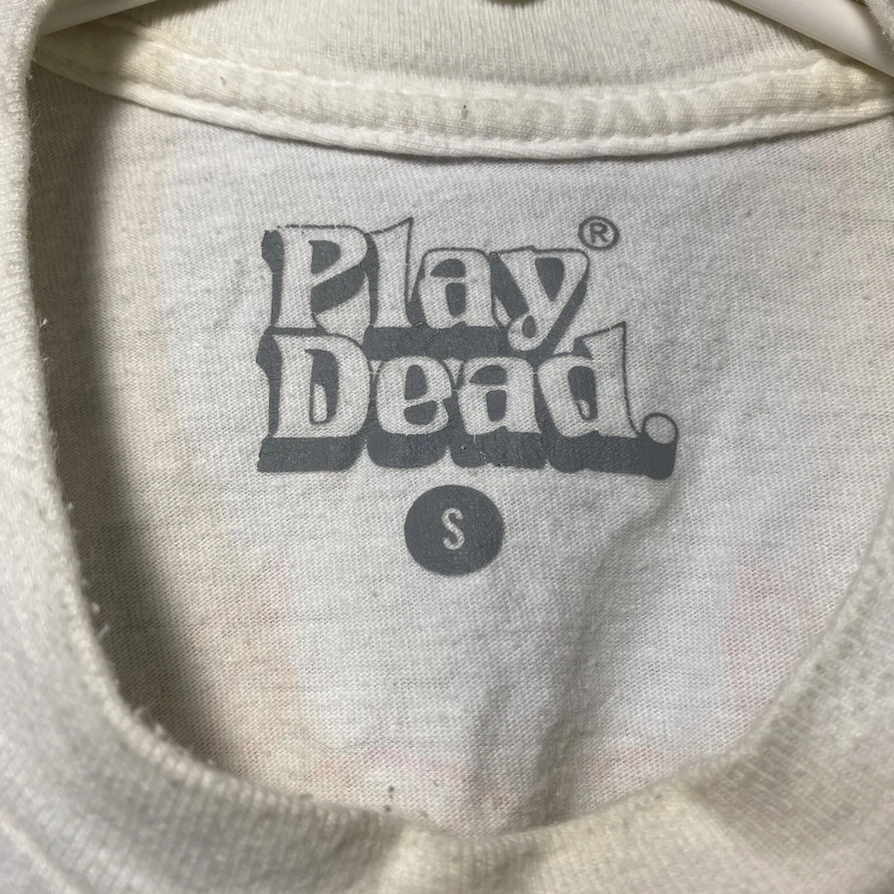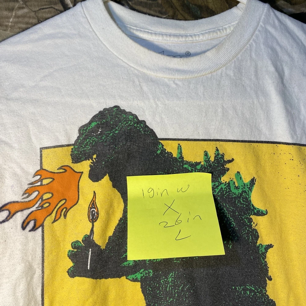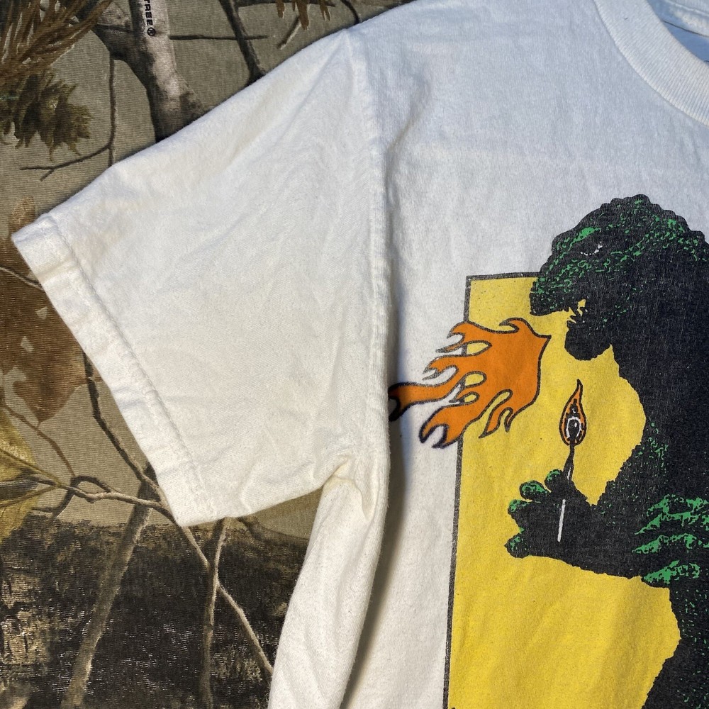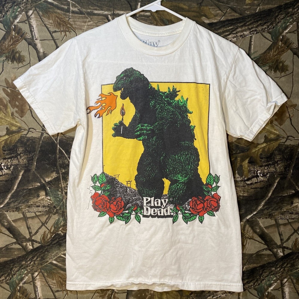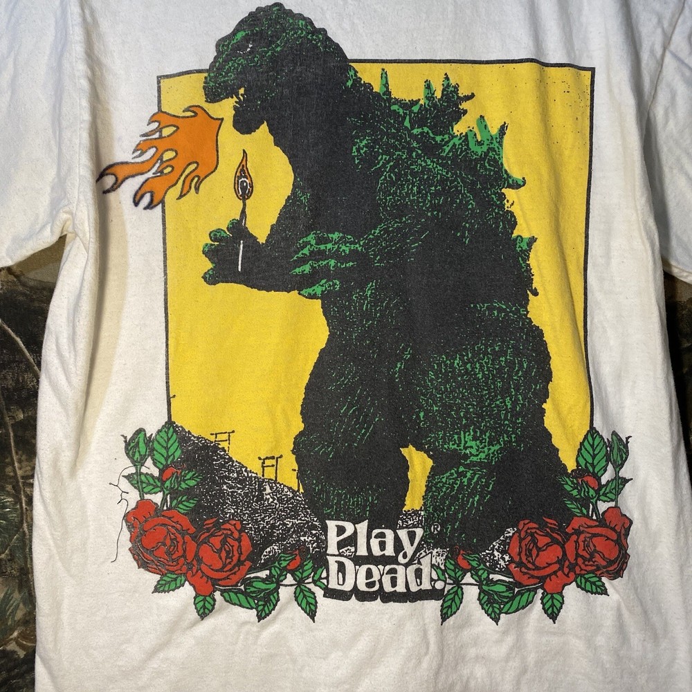 This is a white cotton T-shirt from the "Play Dead Godzilla Loose On The Town Summer Tour 2021" collection by Tour. The shirt features a graphic print of Godzilla on the loose in a city setting. It has short sleeves, a crew neck, and is a size small. The T-shirt is machine washable and has a regular fit, suitable for men to wear during the summer season.