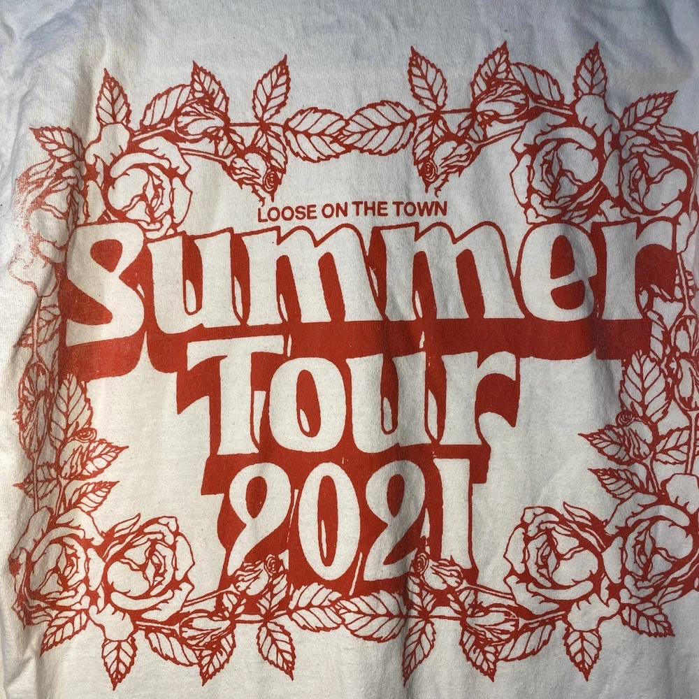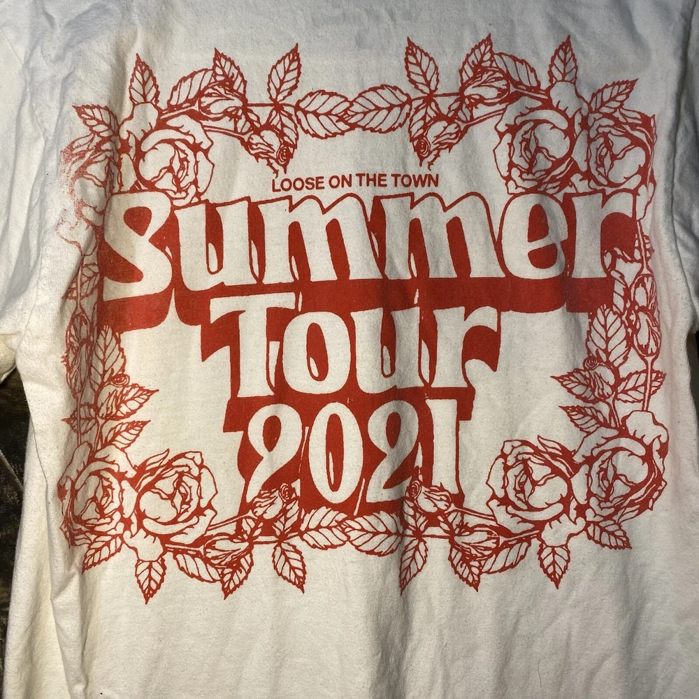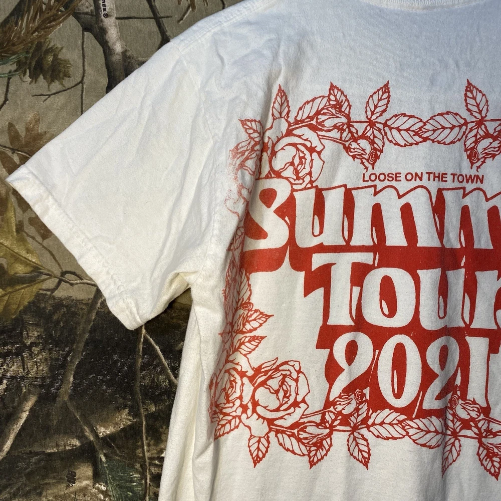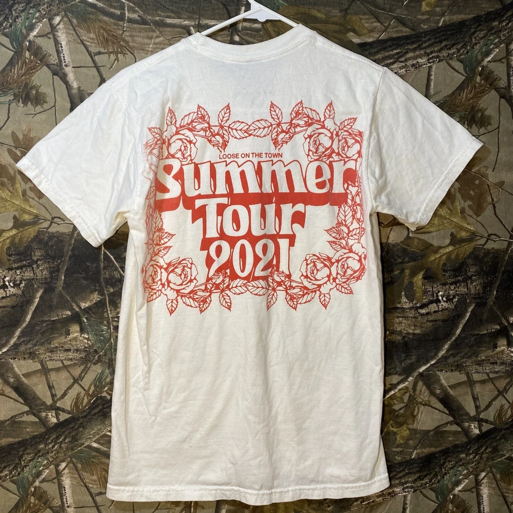 This is a white cotton T-shirt from the "Play Dead Godzilla Loose On The Town Summer Tour 2021" collection by Tour. The shirt features a graphic print of Godzilla on the loose in a city setting. It has short sleeves, a crew neck, and is a size small. The T-shirt is machine washable and has a regular fit, suitable for men to wear during the summer season.