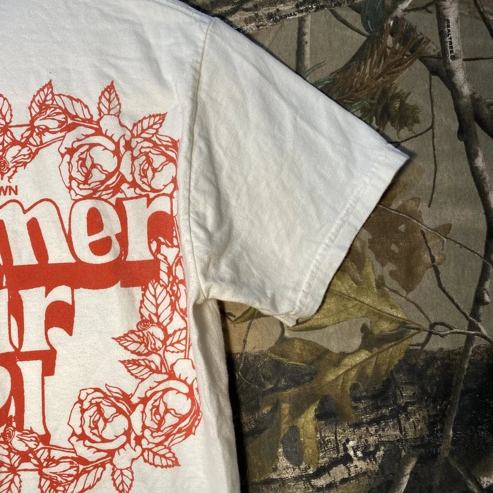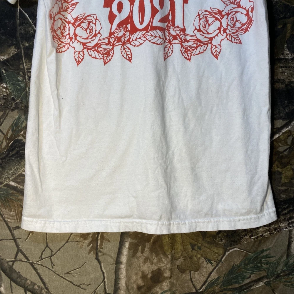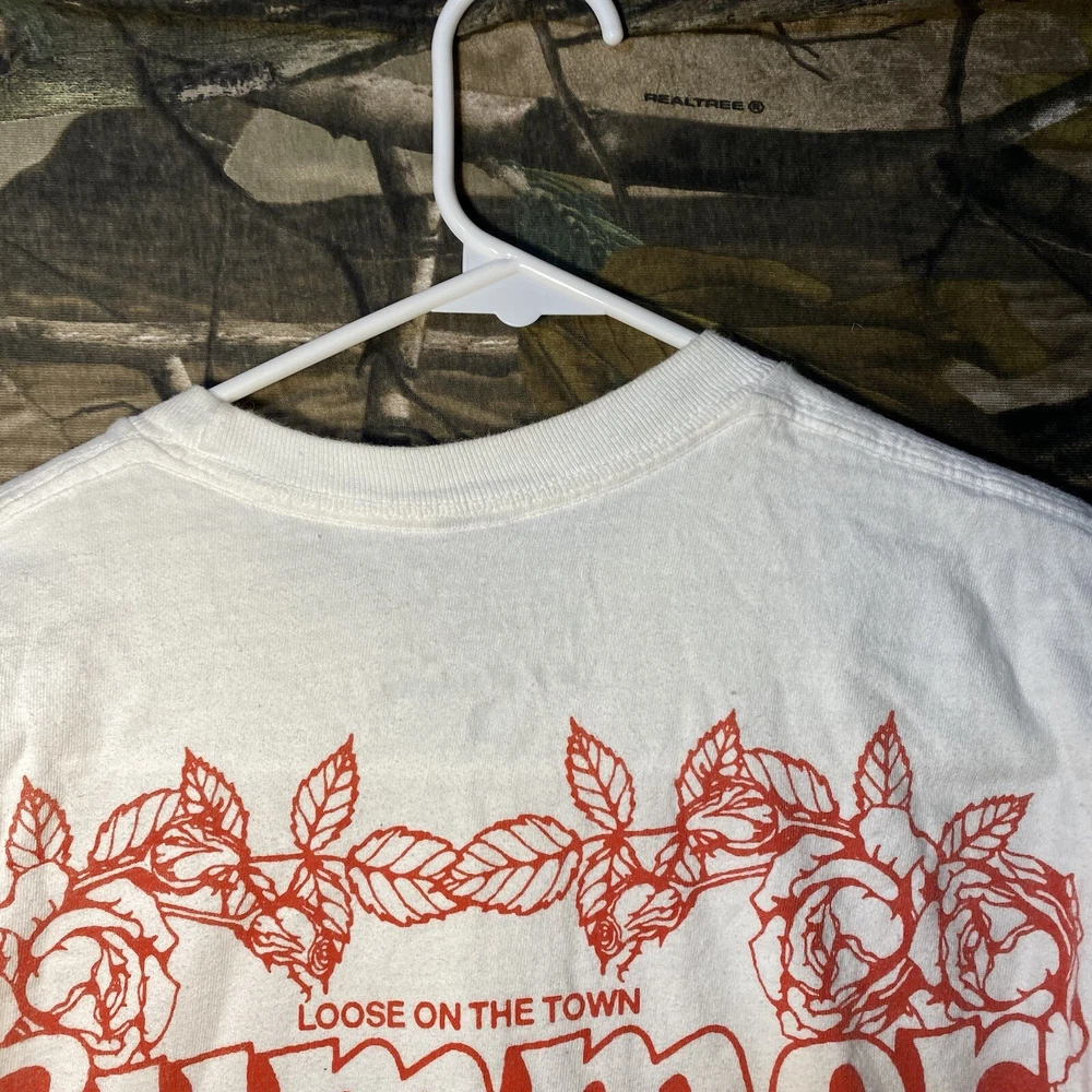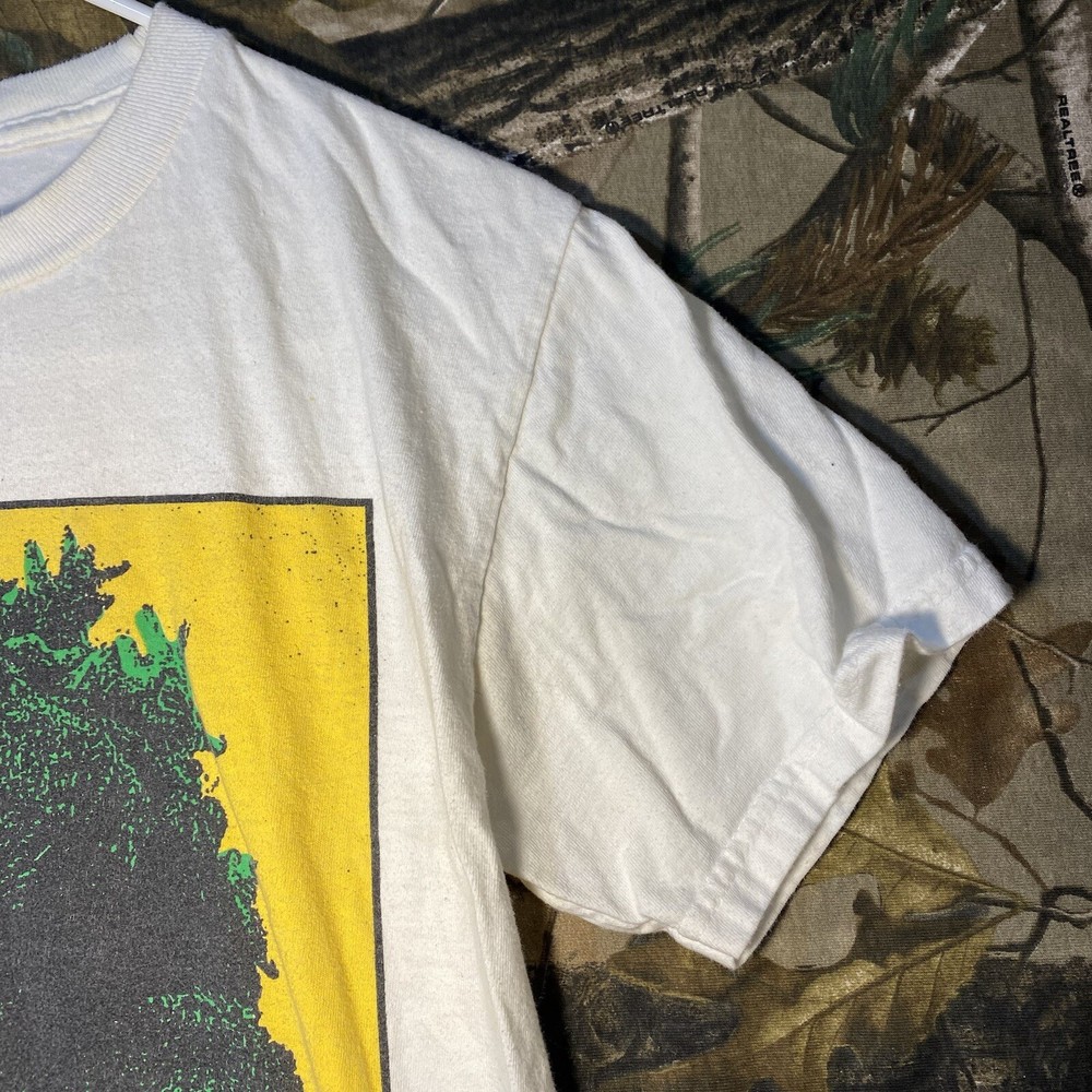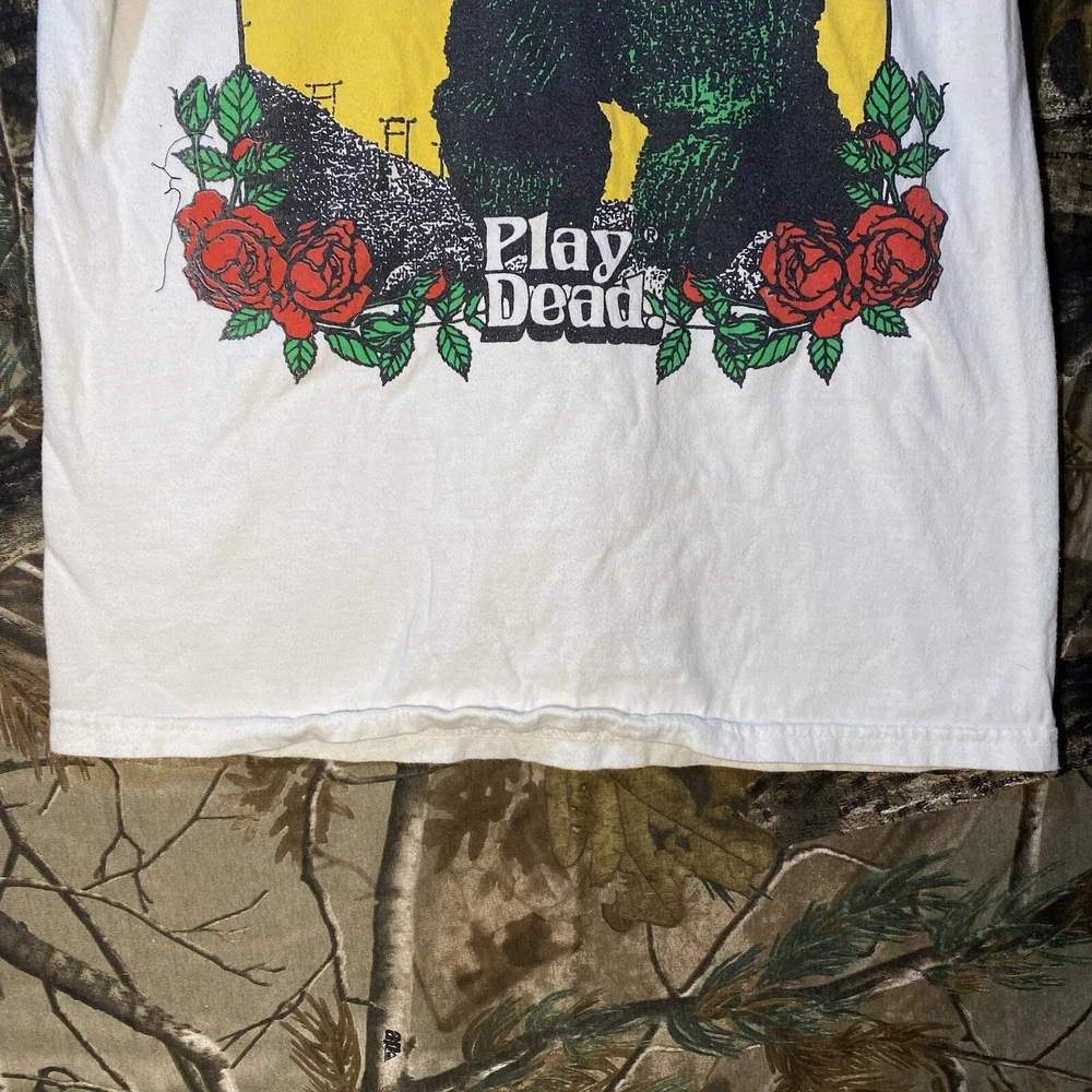 This is a white cotton T-shirt from the "Play Dead Godzilla Loose On The Town Summer Tour 2021" collection by Tour. The shirt features a graphic print of Godzilla on the loose in a city setting. It has short sleeves, a crew neck, and is a size small. The T-shirt is machine washable and has a regular fit, suitable for men to wear during the summer season.