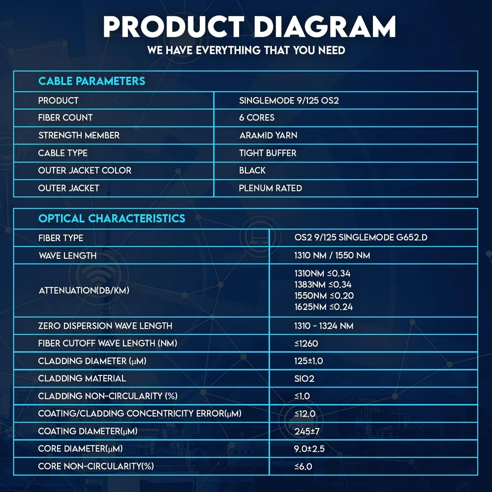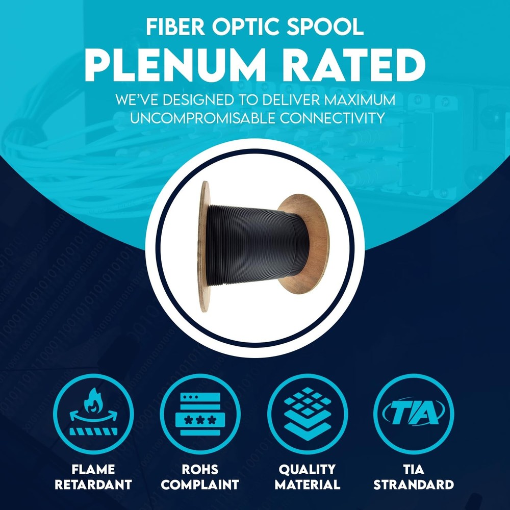 indoor/outdoor plenum rated fiber optic distribution cable intended for long distance runs at high speeds comes in a black 1000 foot spool. It is composed of 6 singlemode fibers (9 micron core) inside a water blocking Aramid yarn wrapped in a black PVC outer jacket. Single mode fiber is optimized to work with fiber optic equipment using light wave lengths of 1310nm (nanometers) or 1550nm. The cladding diameter is 125 microns. The core and cladding of our black bulk indoor/outdoor fiber optic cable is constructed using YOFC FullBand Plus fiber complies with the ITU-T Recommendation G.652.D and the IEC 60793-2-50 type B1.3 Optical Fiber Specification. This particular cable is Plenum Rated.Plenum spaces are the area between floors or above office areas for heating/cooling airflow. If an office were to catch fire, this plenum area could easily allow the spread of the fire to more floors or across the entire building. Plenum rated cables are jacketed with a fire-retardant plastic jacket of either a low-smoke polyvinyl chloride (PVC) or a fluorinated ethylene polymer (FEP) for less toxicity during a fire. Details: G.652.D and the IEC 60793-2-50 type B1.3 Optical Fiber Specification compliant Designed for operation over the full optical spectrum from 1260-1625 nm Lower attenuation over the full optical spectrum from 1260 nm to 1625 nm Supports high-speed transmission technologies such as DWDM and CWDM Compatible with existing 1310 nm equipment Good protection and excellent strip force stability Accurate geometrical parameters that insure low splicing loss and high splicing efficiency Application: Widely used in FTTH access network Telecommunication Networks CCTV Networks Data Communications Networks Local Area Networks High-Quality Fiber Optic Cable: This Distribution Fiber Optic Cable is made with superior quality materials, ensuring high performance and durability. It is designed to provide a reliable and stable connection for your networking needs. Plenum Rated: Our fiber optic cable is plenum rated, which means it meets the safety requirements for installation in plenum spaces. You can trust that our cable is safe and compliant with building codes. Indoor/Outdoor Use: This versatile cable is suitable for both indoor and outdoor use. Whether you need to connect devices within a building or across outdoor areas, this cable is designed to withstand various environmental conditions. Singlemode Fiber: Our fiber optic cable features singlemode fibers that offer low attenuation and high capacity for transmitting data over long distances. It is perfect for applications that require high-speed and long-distance connectivity. G652.D Standard: This cable meets the G652.D standard, which ensures compatibility and interoperability with other networking equipment. You can rely on this cable to seamlessly integrate into your existing network infrastructure.