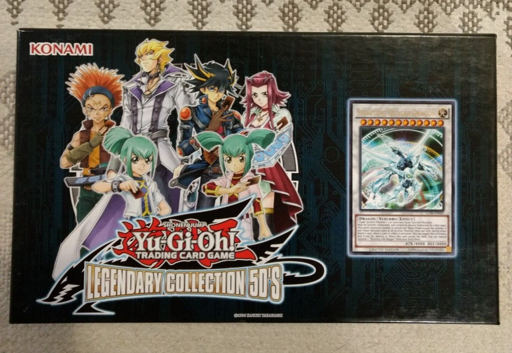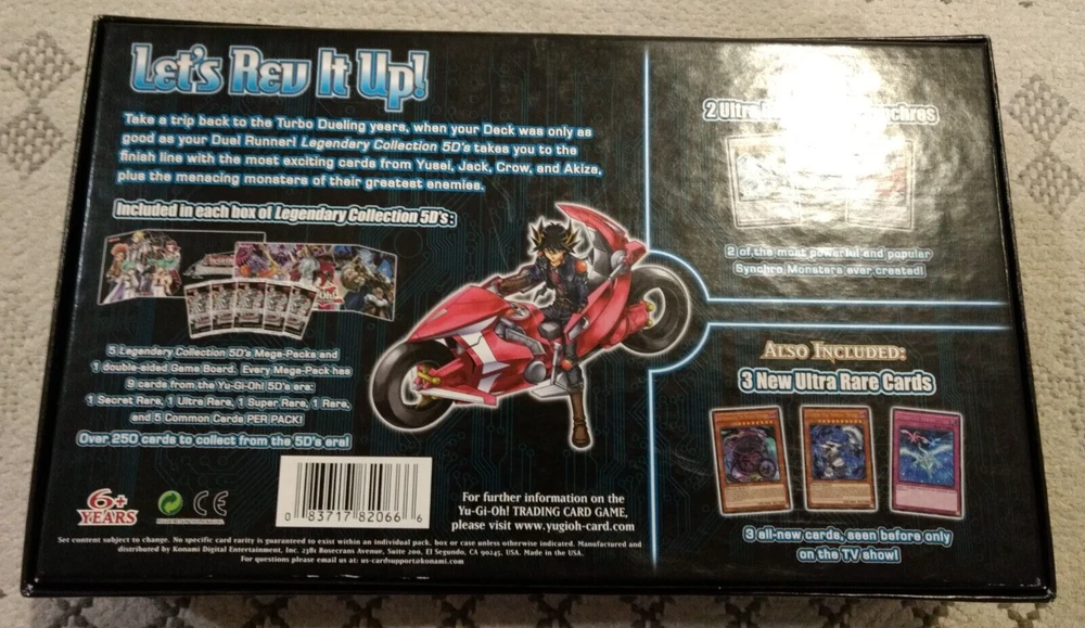 Pre-owned Yu-Gi-Oh! TCG Legendary Collection 5D's box and foldable duel mat (no promo cards or packs) Includes only Yu-Gi-Oh! TCG Box and foldable cardboard double-sided duel mat. Box set has no holes or tears but may have scratched off places on top cover and some bends in the lower box. Cardboard Duel mat has no damages at all. Includes no promo packs or cards inside. But willing to discuss about adding back the included promo cards into collection box set.