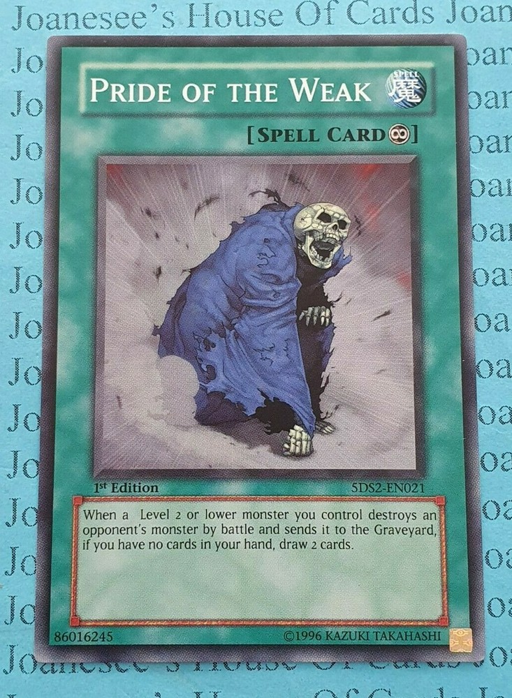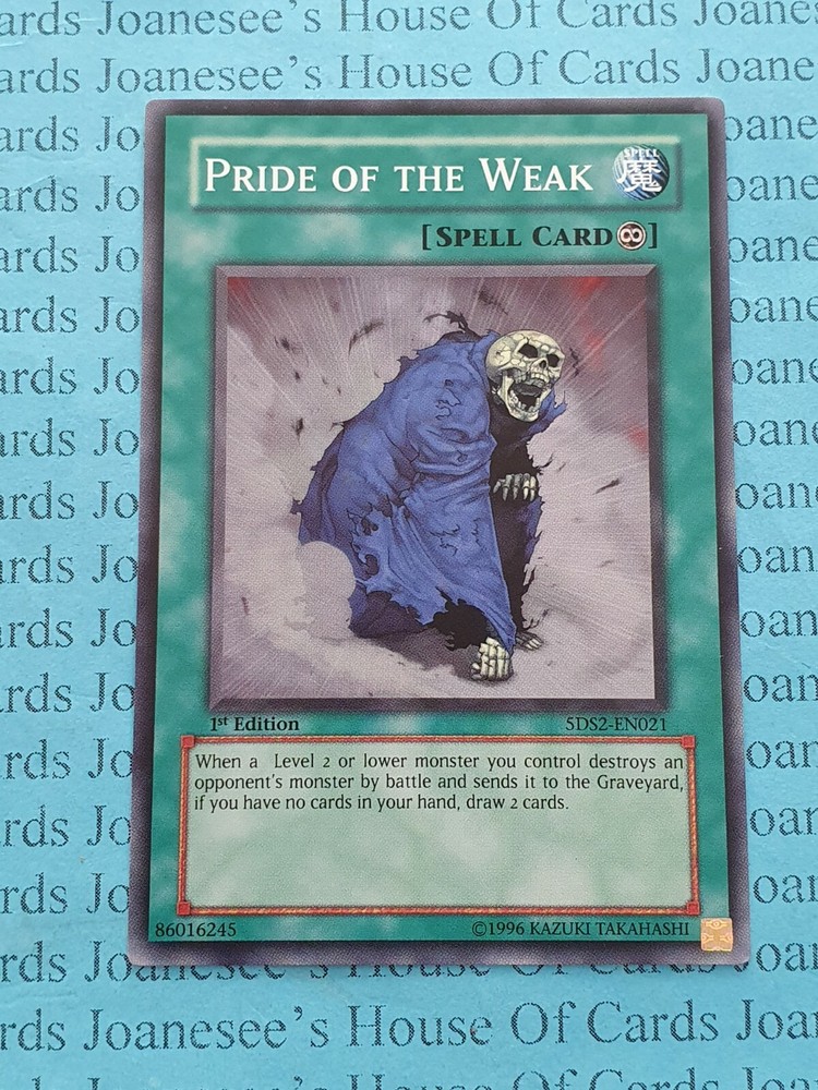 This is a Common Spell Pride of the Weak Card text: When a Level 2 or lower monster you control destroys an opponent's monster by battle and sends it to the Graveyard, if you have no cards in your hand, draw 2 cards. 5DS2 -EN021 1st Edition English Mint/NMint Condition Totally Original Konami (or your money back!) I will deliver in safe packaging to keep it in perfect condition. Ideal for players and collectors alike. Check out my other items! I will combine postage costs for multiple purchases. Sign up for my email newsletters by adding my eBay Shop to your favourites