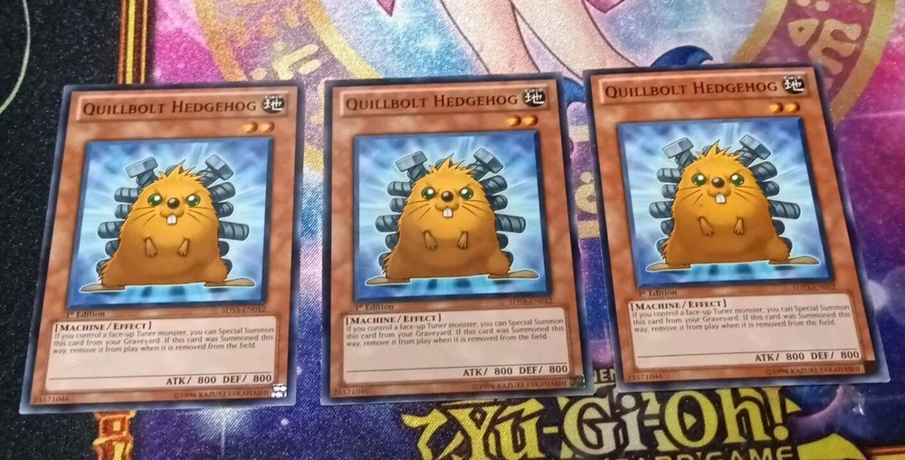 This is a set of three Japanese-sized Yu-Gi-Oh! cards featuring the common rarity Quillbolt Hedgehog. The cards are from the Starter Deck Cards set and are in English language. The card number is 5DS3-EN012 and the card type is effect. The cards are manufactured by Konami and are suitable for ages 6 and up. The finish is regular and the cards are 1st edition. The Quillbolt Hedgehog cards are a great addition to any collector's set of CCG individual cards. They are perfect for players who want to enhance their decks with a unique and rare card. Whether you're a seasoned Yu-Gi-Oh! player or a newcomer to the game, these cards are a must-have. Get your hands on this playset today!