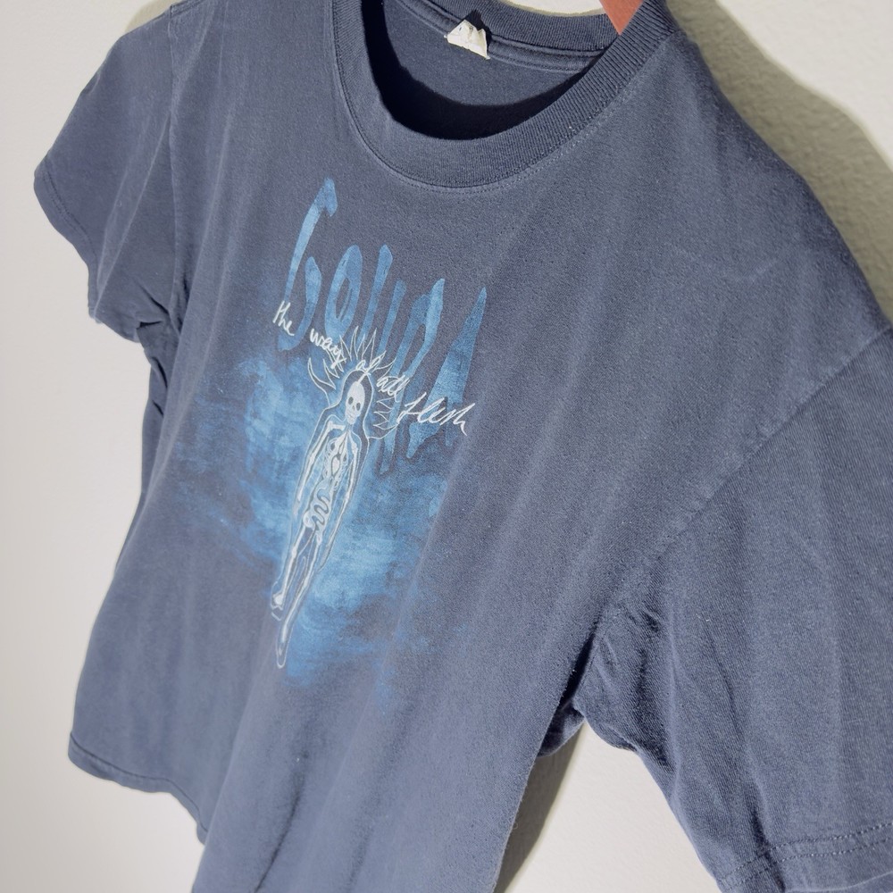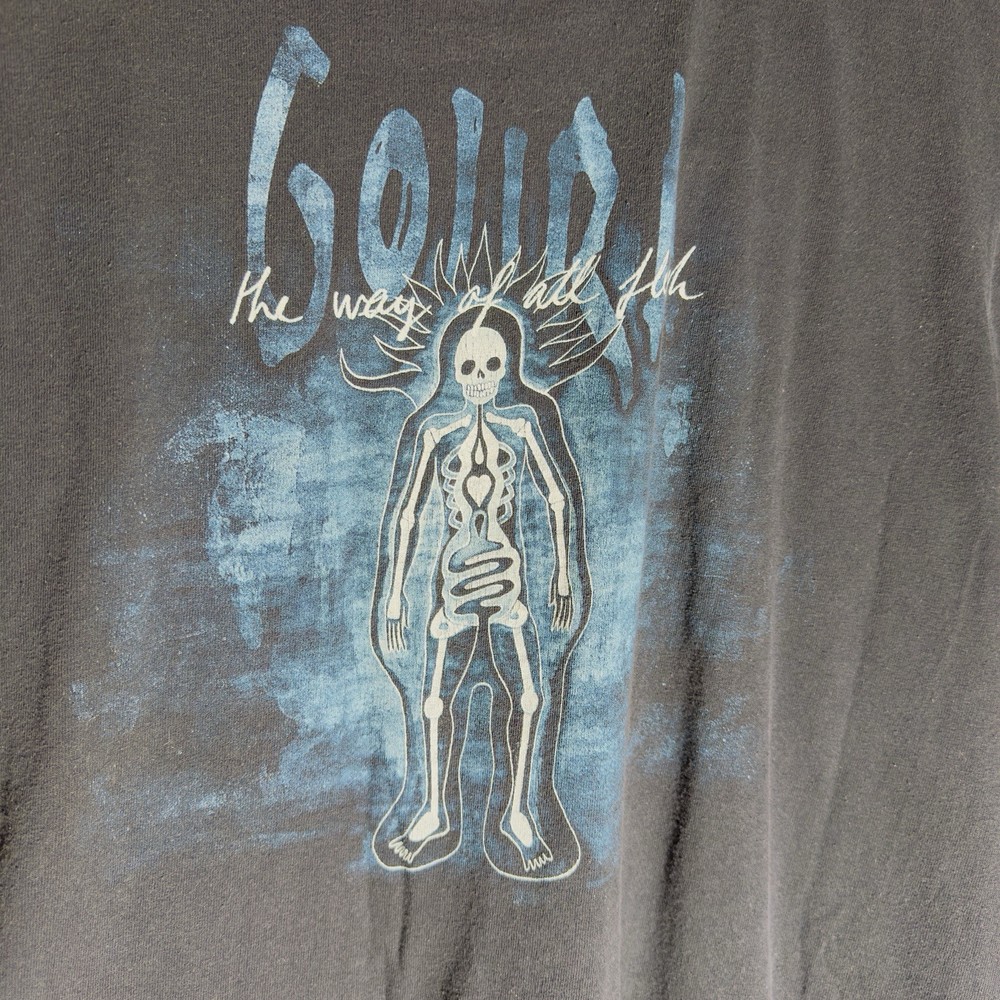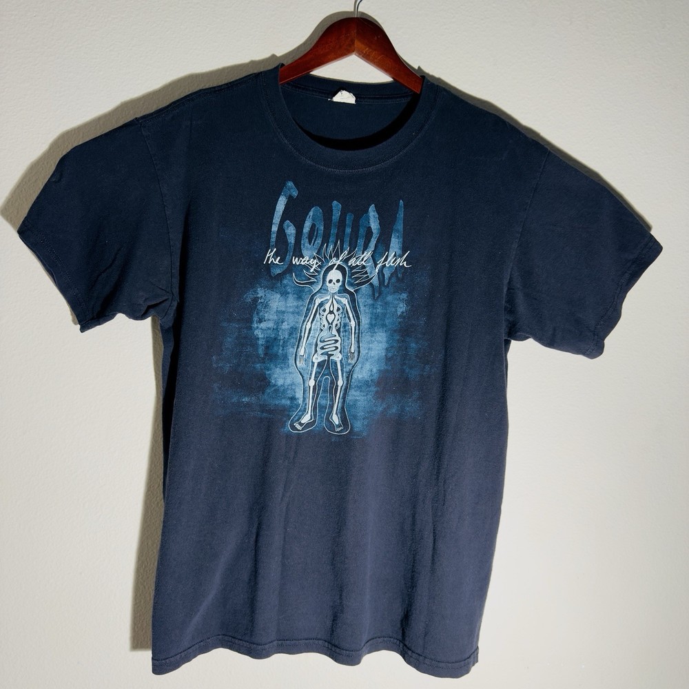 VTG Gojira Way of All Flesh Tee Sz L Anvil Prog Death Metal Band Shirt 2000s Original vintage Gojira “The Way of All Flesh” band tee, size Large, featuring the signature skeletal artwork from their landmark 2008 album. Printed on a well-worn Anvil tag tee (Made in Honduras), 100% pre-shrunk cotton. The shirt has a naturally faded charcoal/black tone with a bold blue-and-white graphic—front only, no back print. Perfect for fans of progressive and death metal or collectors of authentic early 2000s merch. Shows natural wear but no holes or stains. Tag is aged but intact. Classic midweight tee with an early 2000s fit. Measurements (inches): • Chest (Pit to Pit): 19 • Shoulder to Shoulder: 20 • Shoulder to Hem: 29 Condition: Good vintage condition—soft, faded, and broken-in. No major damage. Some wear on the tag. Please review all photos.