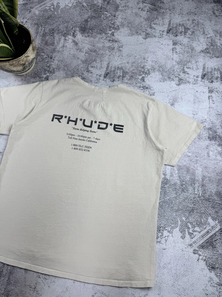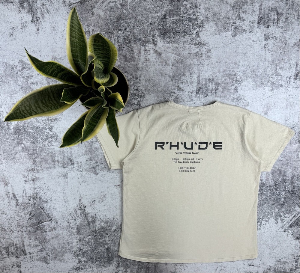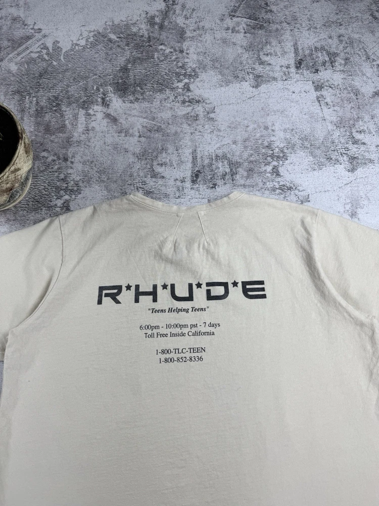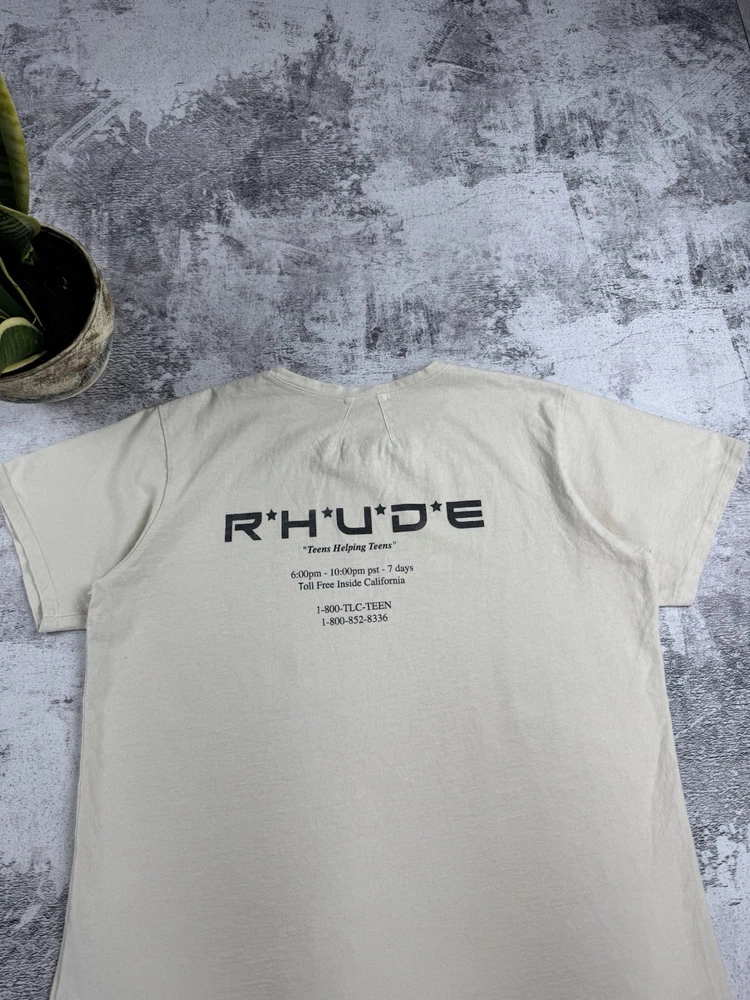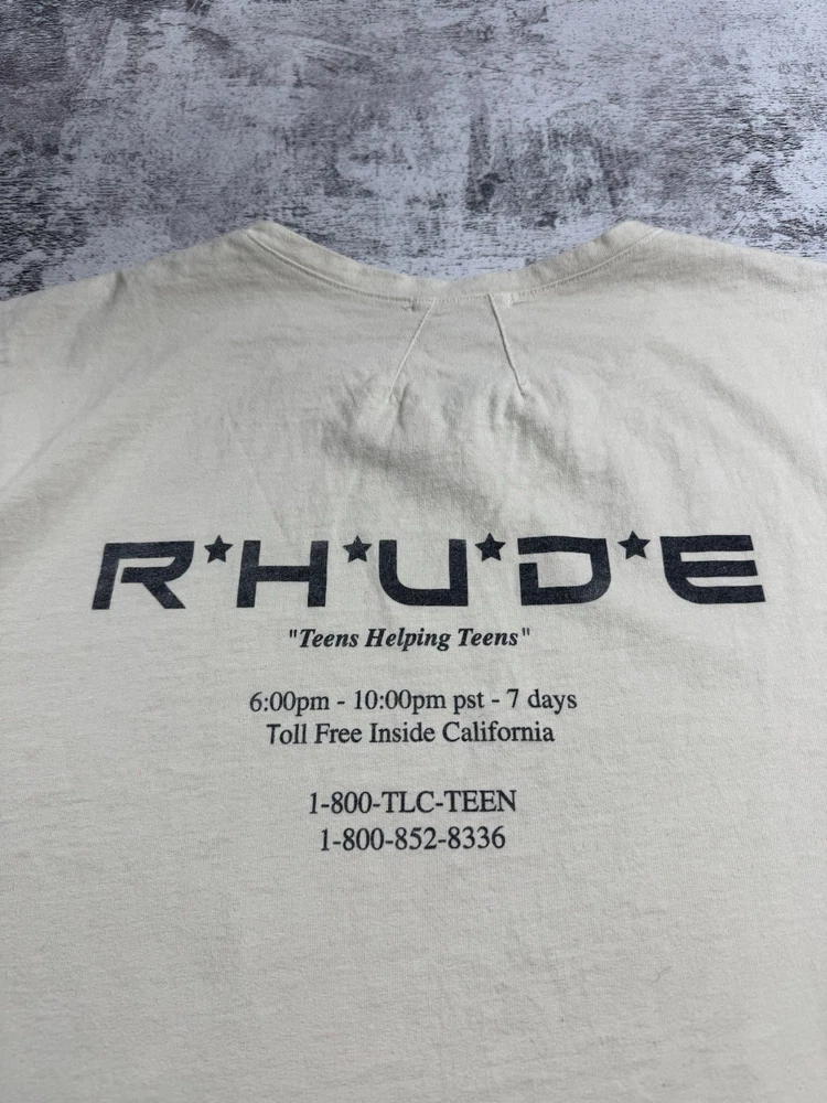 This RHUDE T-Shirt features a graphic print with various characters and themes such as Heart, Art, Biker, Italian, Colorful, Countries, Geek, Band, Birthday, Cartoon, Metal, Beer, Designer, Hip Hop, Cars, Hippie, Horror, Grunge, Cowboy, California, Gothic, Cosplay, Hipster, Music, Indian, 80s, Funny, 90s, Comics, Halloween, and many more. The shirt is made of cotton jersey fabric with a crew neck and short sleeves. It is a relaxed fit t-shirt that is machine washable. The shirt is perfect for all seasons and features a variety of accents such as fur trim, fringe, studded, button, quilted, beaded, buckle, embroidered, sequin, and logo.
