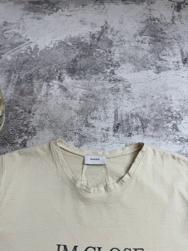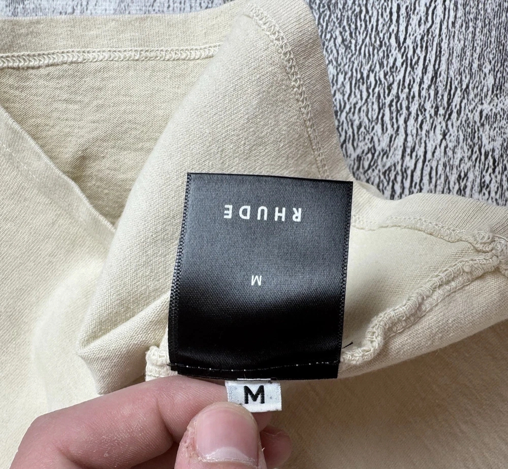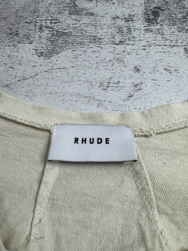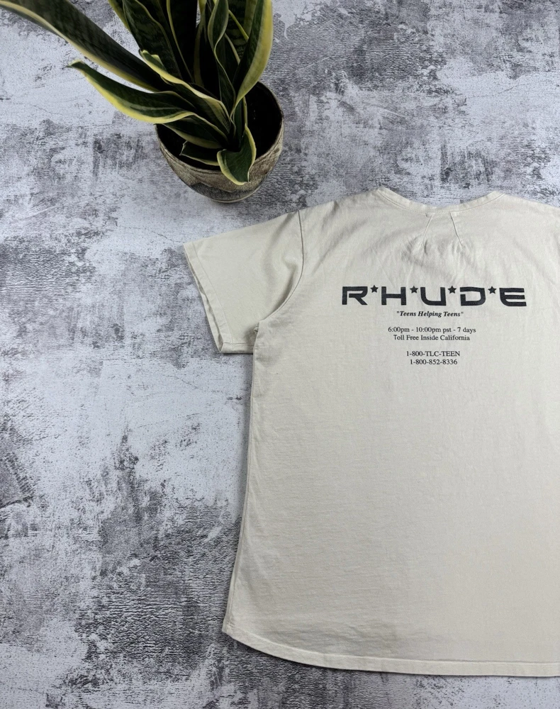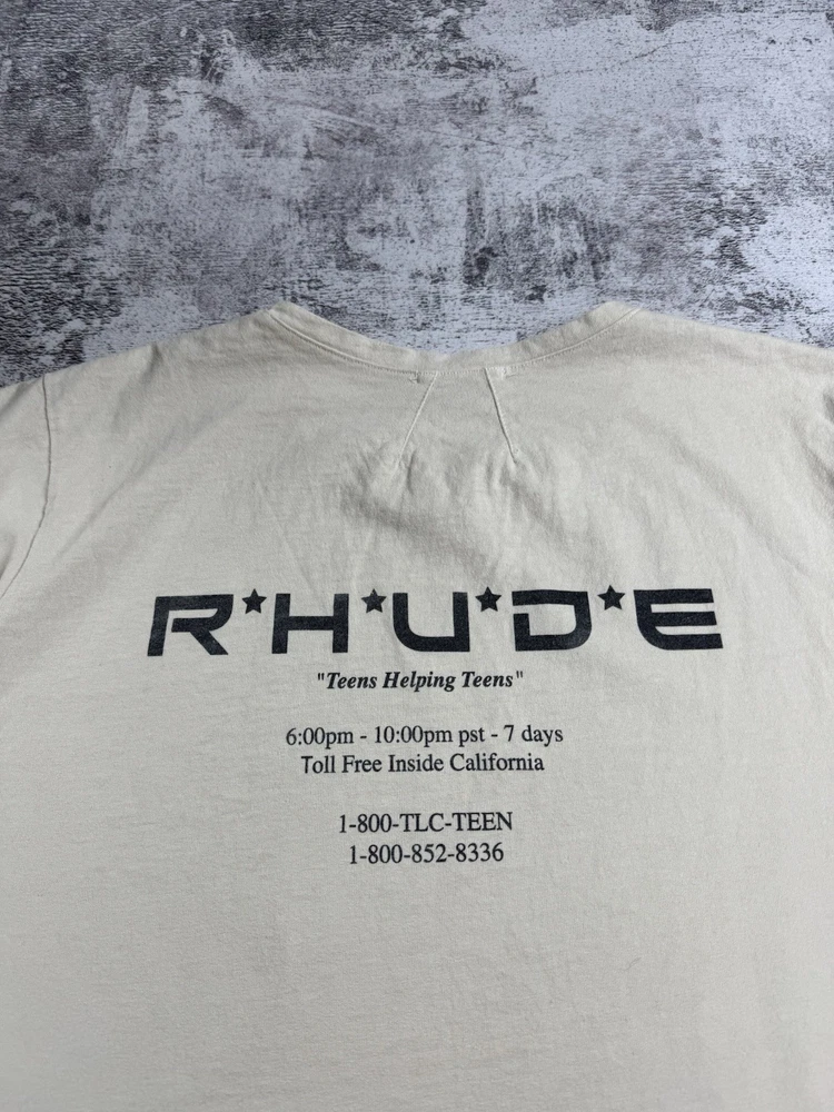 This RHUDE T-Shirt features a graphic print with various characters and themes such as Heart, Art, Biker, Italian, Colorful, Countries, Geek, Band, Birthday, Cartoon, Metal, Beer, Designer, Hip Hop, Cars, Hippie, Horror, Grunge, Cowboy, California, Gothic, Cosplay, Hipster, Music, Indian, 80s, Funny, 90s, Comics, Halloween, and many more. The shirt is made of cotton jersey fabric with a crew neck and short sleeves. It is a relaxed fit t-shirt that is machine washable. The shirt is perfect for all seasons and features a variety of accents such as fur trim, fringe, studded, button, quilted, beaded, buckle, embroidered, sequin, and logo.