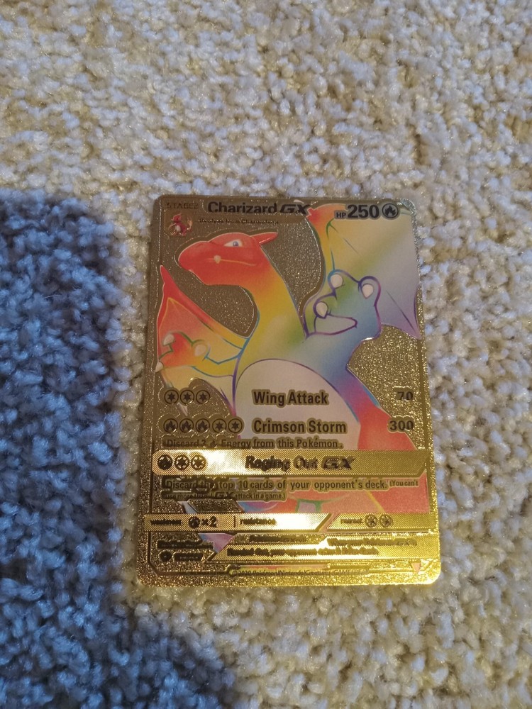 This is a golden rarity pokemon! TCG card featuring Charizard from the GX series. The card's name is "Charzard" and it is a normal type card. It has a beautiful rainbow background that makes it a must-have for collectors and fans alike. The card is in great condition and has only been used minimally, making it very new. It's perfect for adding to your collection or for use in your next game.