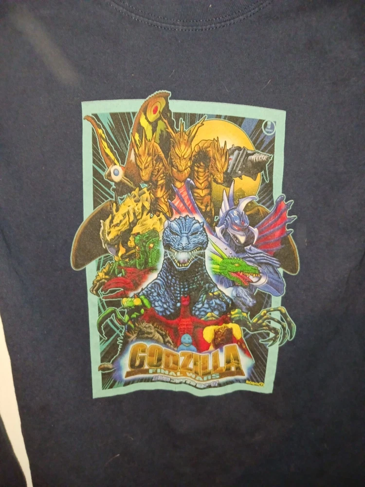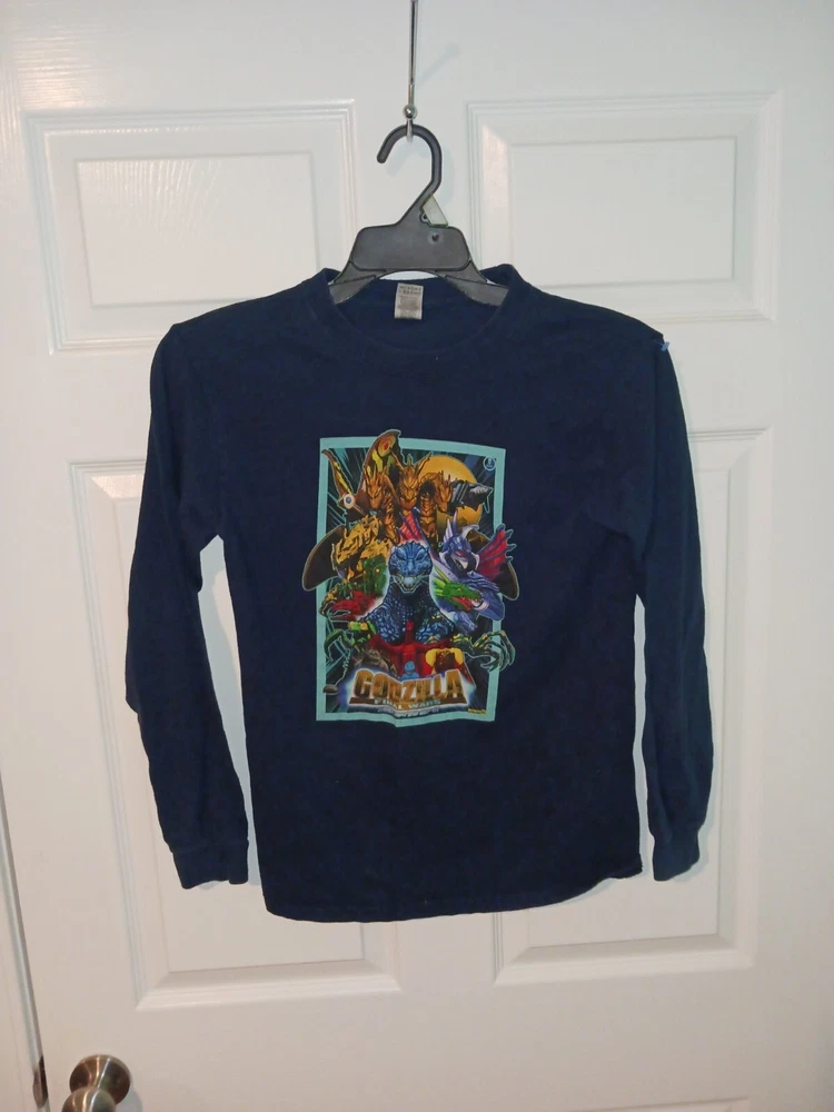 This rare Godzilla Final Wars graphic shirt is a must-have for any fan of the iconic movie character. The long sleeve T-shirt is designed for teens and comes in a navy color with a movie theme. The shirt is made from high-quality materials and features the Godzilla character family, making it a perfect addition to any fan's collection. The shirt is available in a size small and is suitable for regular size types.