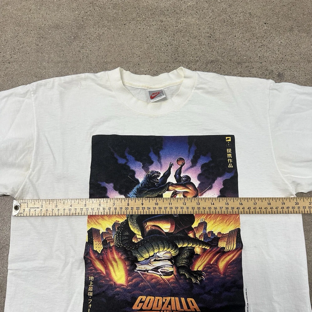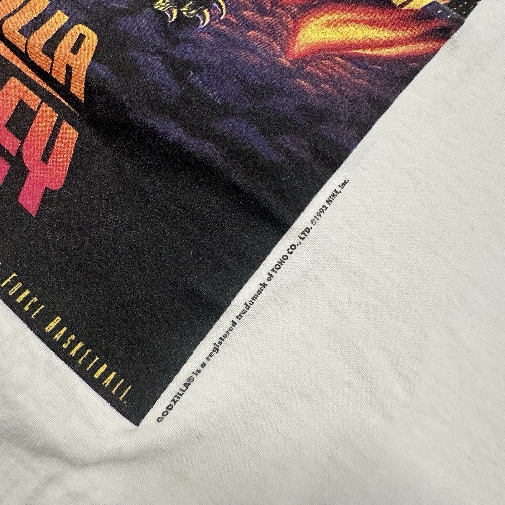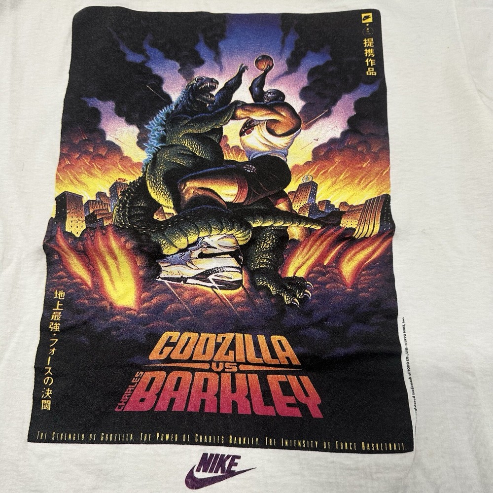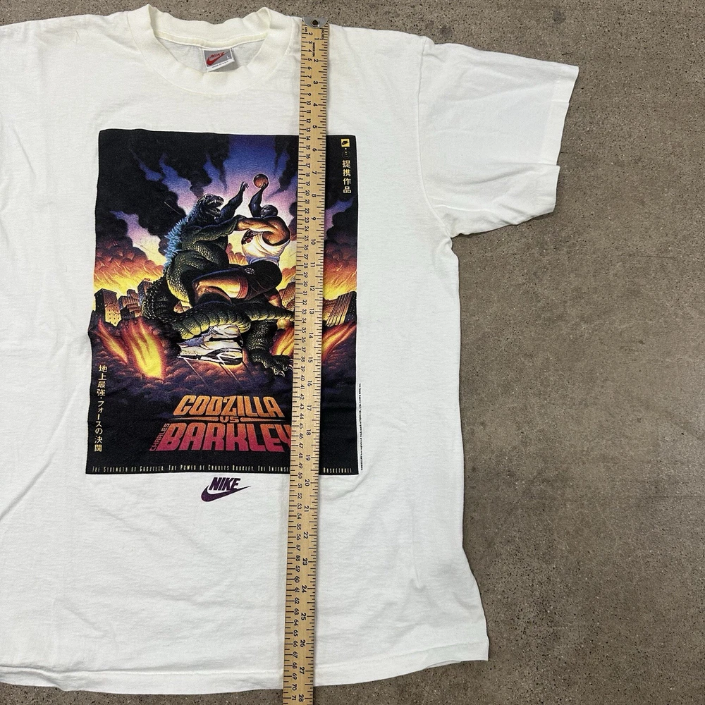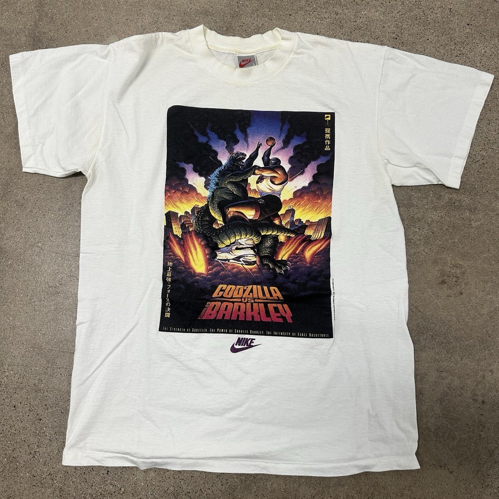 Rare VTG NIKE Charles Barkley vs Godzilla 1992 Spell Out Swoosh T Shirt 90s SZ L Slight yellowing around the collar as shown in photos