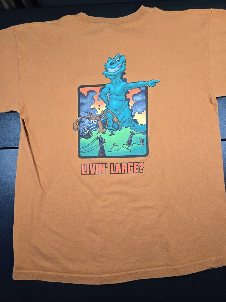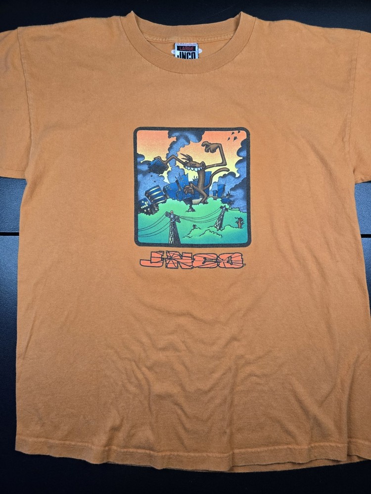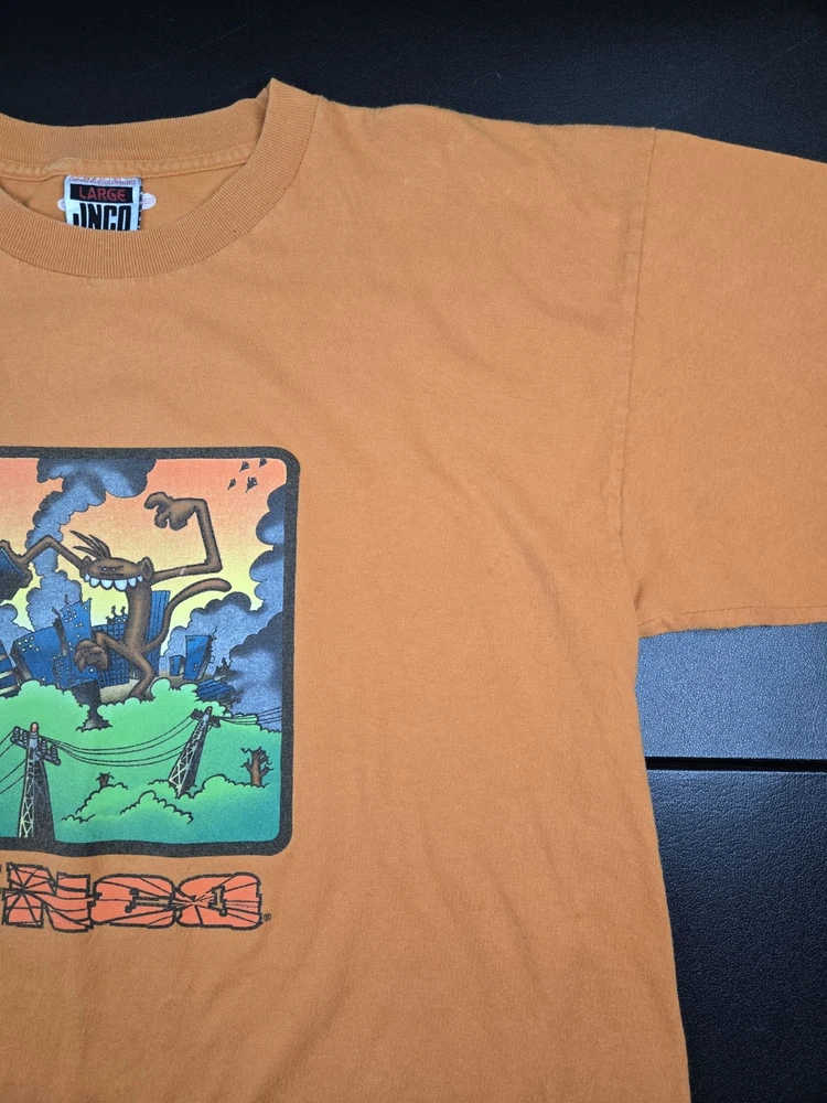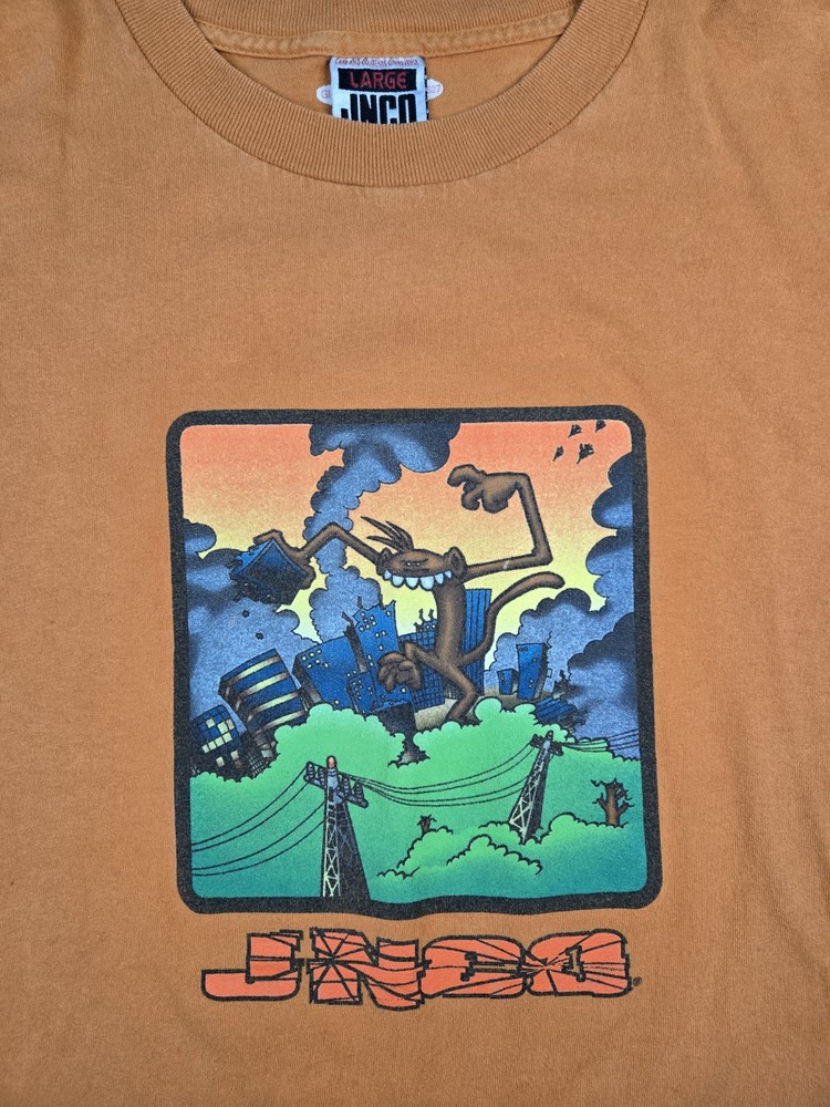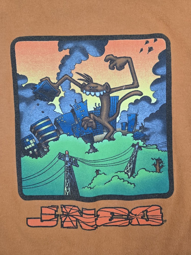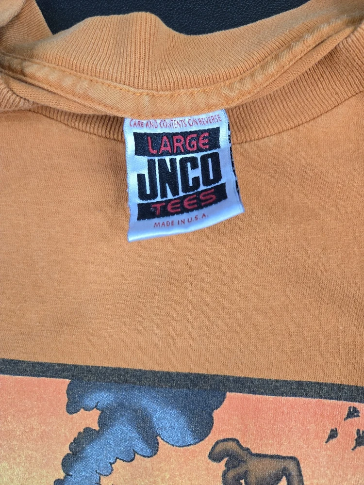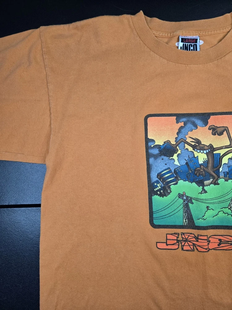 Embrace the nostalgia of the 90s with this rare JNCO Jeans Monkey Godzilla "Livin Large" Skate Tee. The iconic blue T-shirt features a vibrant graphic print that showcases a colorful and artistic representation of the classic cartoon character. The tee is crafted from soft, breathable cotton material that ensures comfort and ease of movement, making it a perfect choice for all seasons. This machine washable T-shirt comes in size XL (23x30") and fits true to size for a regular fit. It has a classic crew neck and short sleeves, making it a versatile addition to any wardrobe. The shirt is a limited edition vintage piece from the JNCO brand, made in the United States, and is part of their unique product line. Don't miss your chance to own this unique and stylish retro tee.