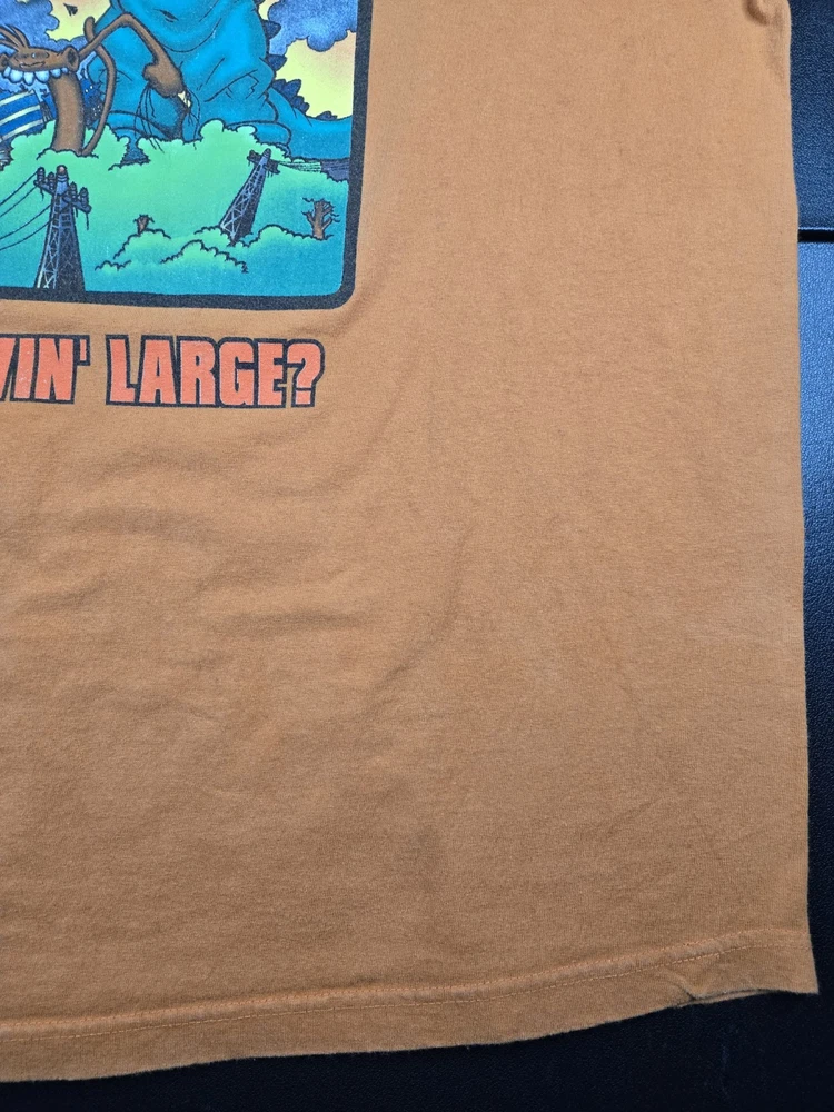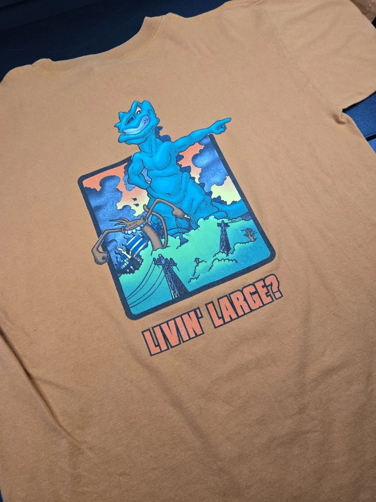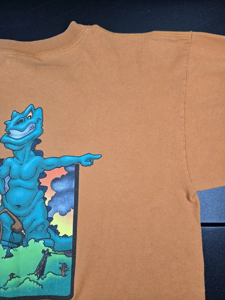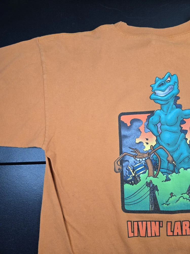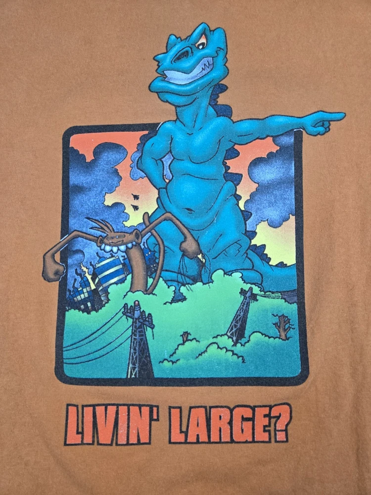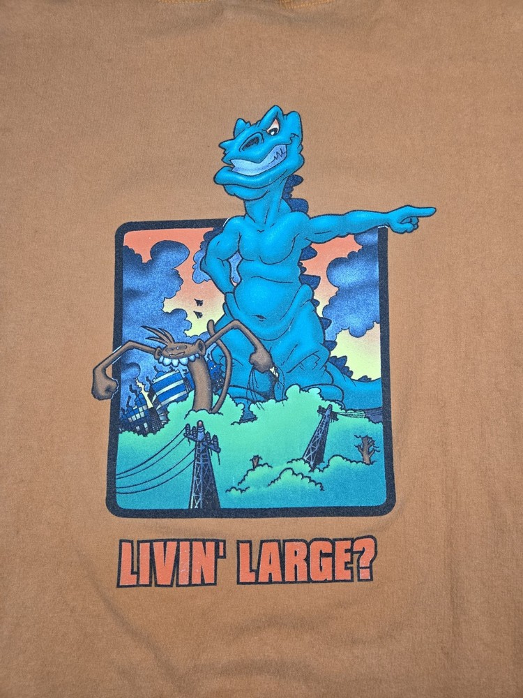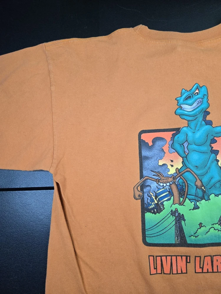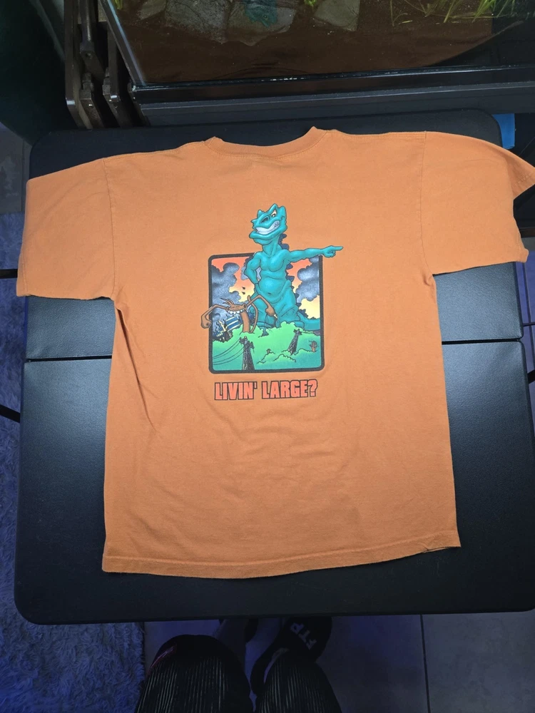 Embrace the nostalgia of the 90s with this rare JNCO Jeans Monkey Godzilla "Livin Large" Skate Tee. The iconic blue T-shirt features a vibrant graphic print that showcases a colorful and artistic representation of the classic cartoon character. The tee is crafted from soft, breathable cotton material that ensures comfort and ease of movement, making it a perfect choice for all seasons. This machine washable T-shirt comes in size XL (23x30") and fits true to size for a regular fit. It has a classic crew neck and short sleeves, making it a versatile addition to any wardrobe. The shirt is a limited edition vintage piece from the JNCO brand, made in the United States, and is part of their unique product line. Don't miss your chance to own this unique and stylish retro tee.