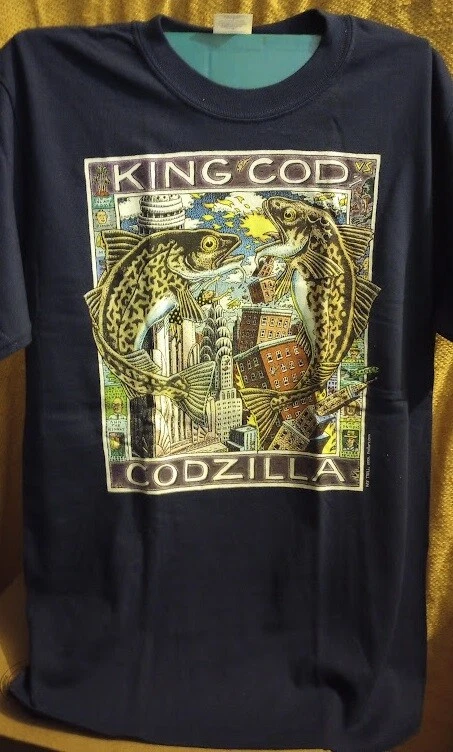 Alaskan artist Ray Troll loves a good pun or play on words. King Cod climbs the Empire State building as he battles a fire breathing Codzilla destroying skyscrapers in this city. This is a discontinued or retired design that is no longer in print. It features an animal print graphic with short sleeves and a crew neck. Made from 100% cotton knit fabric, this shirt is preshrunk, heavyweight, non-iron, wrinkle-resistant, and suitable for all seasons. This shirt is ideal for both men and women and is a great addition to any casual wardrobe. The price includes domestic shipping. . Check out my other listings for many more new discontinued design t-shirts with art by Ray Troll. You may want to follow me if you like this style and brand of new shirts. Due to sponsored listings I am buried under low quality shirts and those that do not match your search terms.