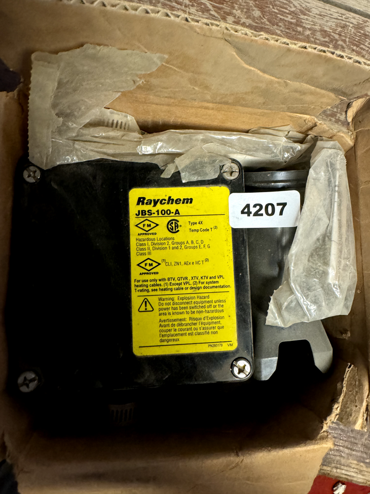 The Raychem JBS-100-A Heating Cable Power Connection Kit is a robust and dependable solution designed for connecting heating cables in various industrial and commercial applications. Engineered for efficiency and durability, this kit ensures secure and effective power connections to heating cables, enhancing system performance and safety. Key Features: Brand: Raychem Model: JBS-100-A Type: Heating Cable Power Connection Kit Application: Designed for connecting power to heating cables in pipe freeze protection and roof & gutter de-icing systems Material: High-quality components for durability and reliability Compatibility: Suitable for use with Raychem heating cables and other compatible systems Additional Details: Condition: New Components Included: Includes necessary components for a complete power connection (e.g., junction box, connectors, and sealing materials) Installation: User-friendly design for easy and secure installation Environmental Resistance: Resistant to harsh environmental conditions including moisture, UV exposure, and extreme temperatures Safety: Provides a secure and moisture-resistant seal to protect electrical connections Certifications: Complies with relevant safety standards and certifications Warranty: Manufacturer warranty included