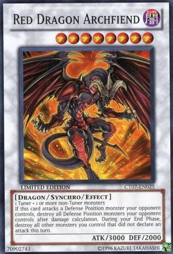 The Red Dragon Archfiend CT05-EN002 Secret Rare card is a highly sought-after collectible for fans of the Yu-Gi-Oh! TCG. This limited edition Synchro card, part of the 5D's 2008 set, features the iconic Red Dragon Archfiend design. With its rarity and special status, this card is a valuable addition to any collector's deck.