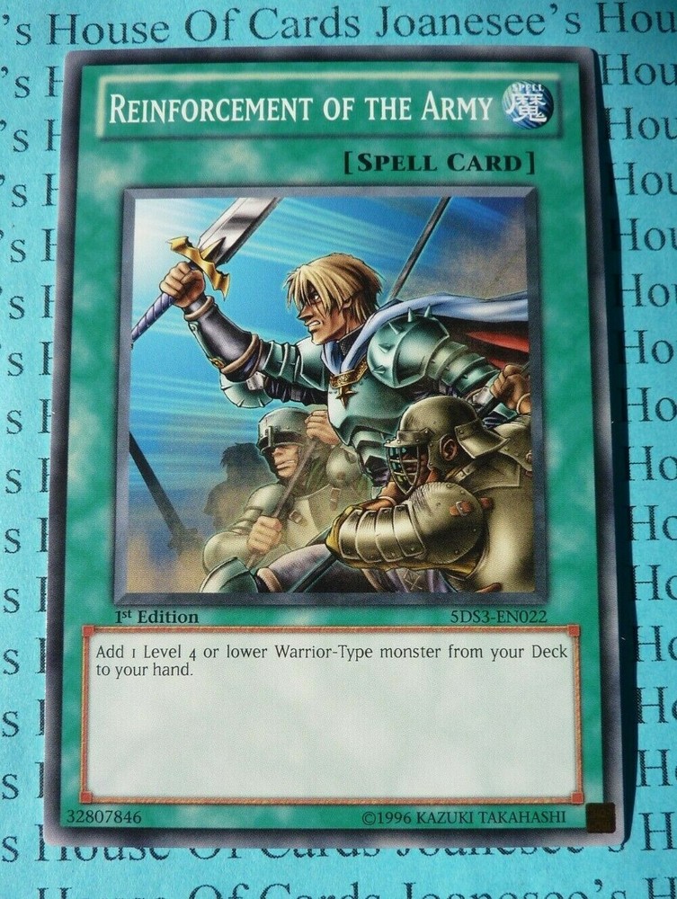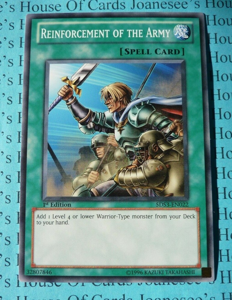 This is the Common Spell Reinforcement of the Army Card text: Add 1 Level 4 or lower Warrior monster from your Deck to your hand. 5DS3-EN022 1st Edition English Mint/NMint Condition Totally Original Konami (or your money back!) I will deliver in safe packaging to keep it in perfect condition. Ideal for players and collectors alike. Check out my other items! I will combine postage costs for multiple purchases. Sign up for my email newsletters by adding my eBay Shop to your favourites