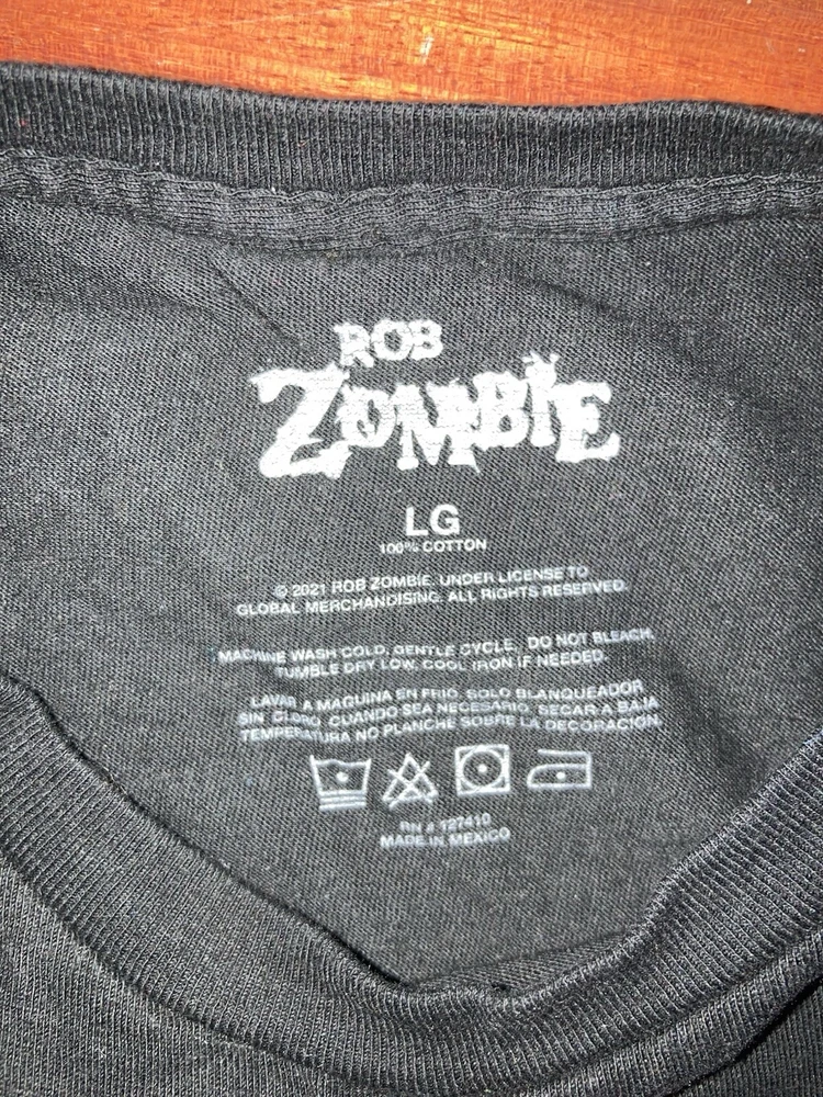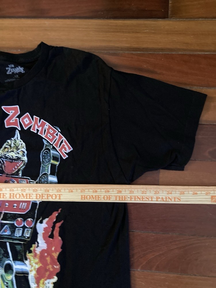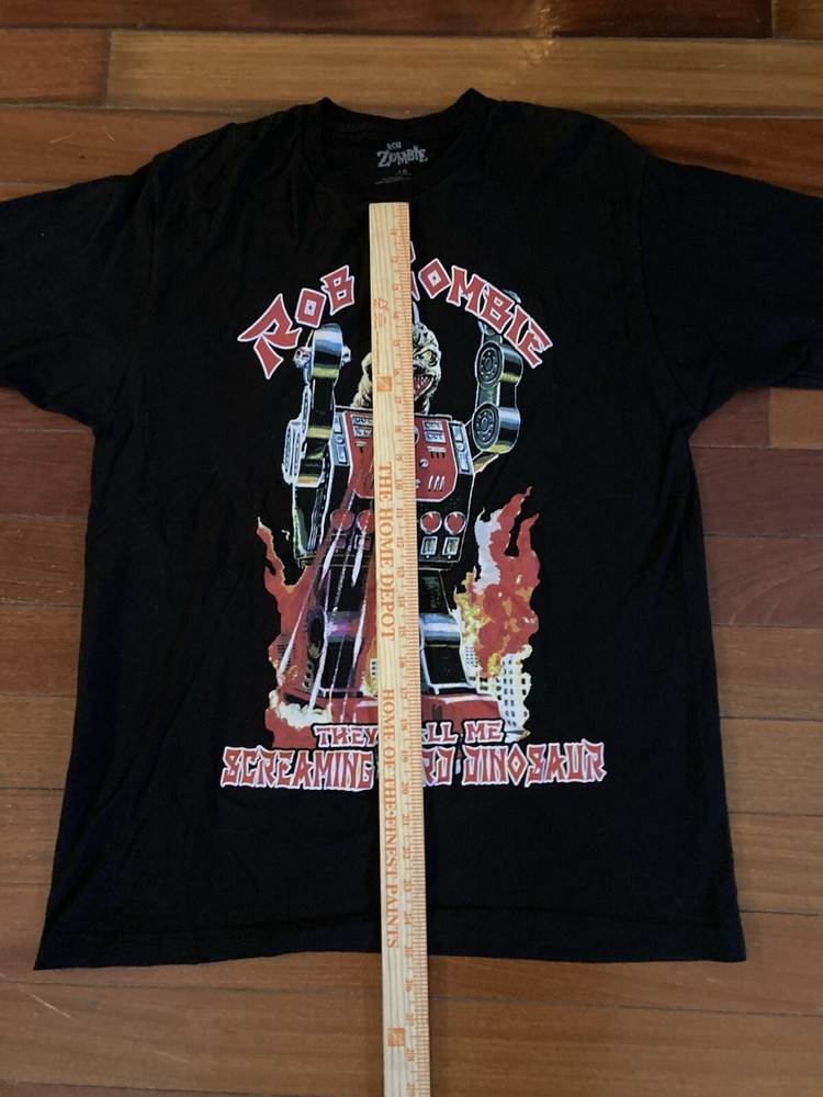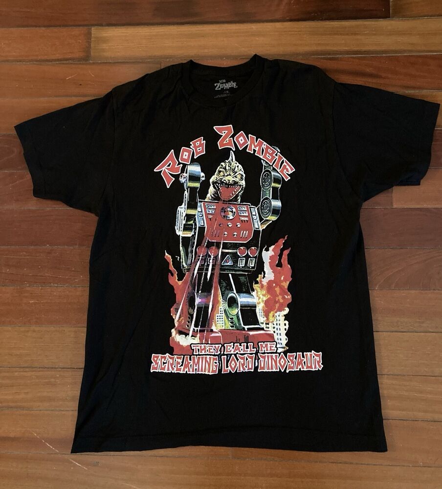 This Rob Zombie Screaming Lord Dinosaur Shirt is a must-have for any music lover. The black graphic tee features a crew neck and short sleeves, making it perfect for a casual day out or a concert. The shirt is made of high-quality material and is a size L, fitting regular size charts. The shirt's theme includes rock, metal, and retro elements, making it a great addition to any music fan's collection. The shirt's design includes a robot Godzilla graphic, adding a unique touch to the overall look. This T-shirt is perfect for any occasion, whether it's a music tour or a casual day out. Get your hands on this exclusive Rob Zombie shirt today!