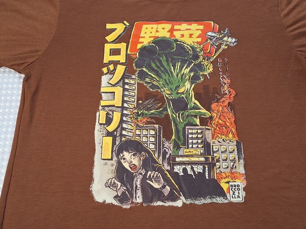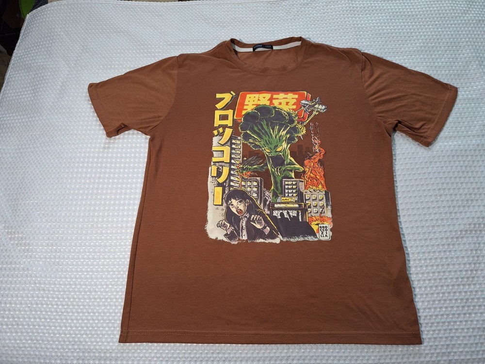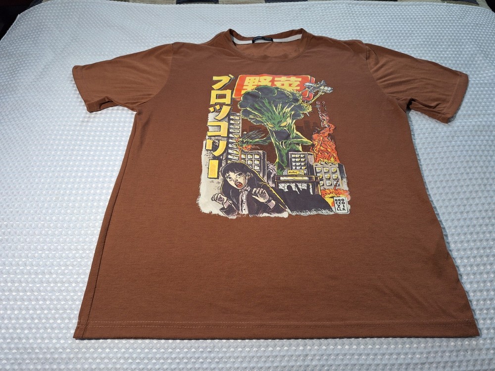 Romwe Broccozilla Anime Japan Brown Cotton T-shirt Size M Broccoli Godzilla,100% Polyester, about 28 inches tall by 21 inches wide at the chest, Good Condition Buy 2 or More Shirts and Get 10% Off Each
