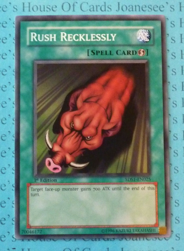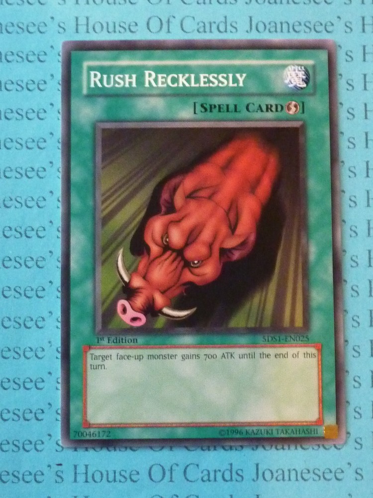 This is a Common Spell Rush Recklessly Card text: Target 1 face-up monster on the field; it gains 700 ATK until the end of this turn. 5DS1 -EN025 1st Edition English Mint/NMint Condition Totally Original Konami (or your money back!) I will deliver in safe packaging to keep it in perfect condition. Ideal for players and collectors alike. Check out my other items! I will combine postage costs for multiple purchases. Sign up for my email newsletters by adding my eBay Shop to your favourites