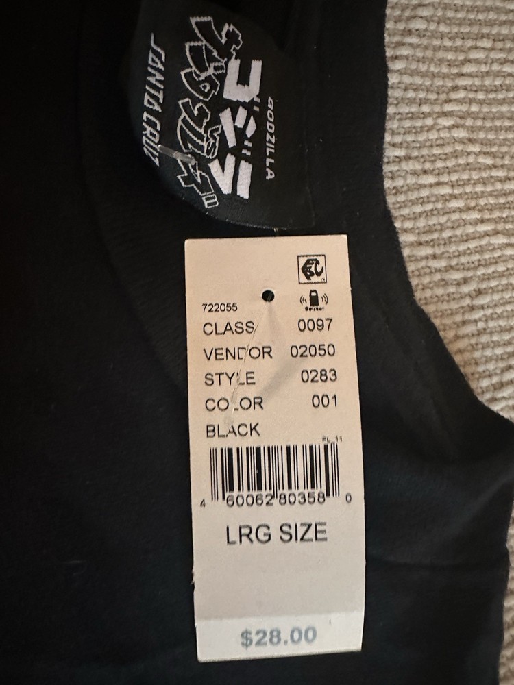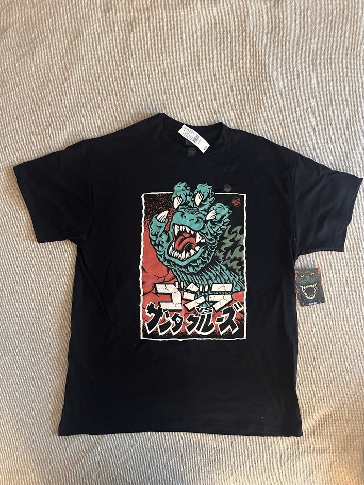 The SANTA CRUZ X Godzilla Men's Short Sleeve T-Shirt in size Large features a classic fit and a crew neck design. Made from breathable cotton fabric, this black shirt is adorned with a great graphic of Godzilla's hand, making it a perfect choice for casual and party wear. Machine washable and suitable for all seasons, this unisex t-shirt is a great addition to any wardrobe for fans of the Santa Cruz brand and Godzilla.