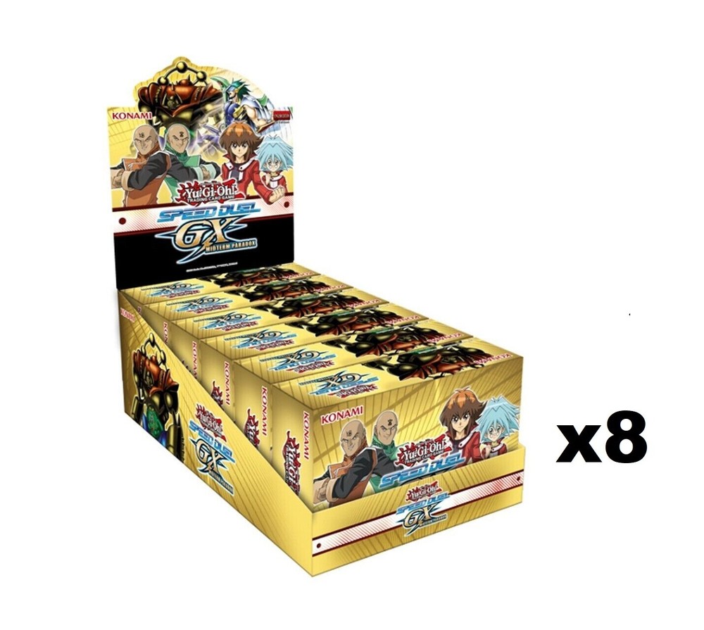 In the Yu-Gi-Oh! GX animated series, Dr. Crowler hired the Paradox Brothers to teach Jaden Yuki and Syrus Truesdale a lesson! Now you can step into the shoes of the Slifer Red students – or their opponents – in Speed Duel GX: Midterm Paradox Mini Box! Speed Duel GX: Midterm Paradox Mini Box expands on the Speed Duel GX: Duel Academy Box introducing even more cards from the YuGi-Oh! GX anime series that are new to Speed Duel! Speed Duel GX: Midterm Paradox is a 100-card static set that contains 4 complete Speed Duel Decks ready-to-play out of the box! Here is just some of what you can expect. ★ Pre-built Decks for Jaden Yuki, Syrus Truesdale, Bastion Misawa, and the Paradox Brothers! ★ Brand-new Skill Cards for iconic Yu-Gi-Oh! GX characters! ★ Explore new strategies with additional cards and upgrade the Speed Duel Decks you already own! ★ Discover Secret Rare variants of popular GX-era cards! ★ Play with it on its own, or as a perfect complement to the Speed Duel GX: Duel Academy Box Each Speed Duel GX: Midterm Paradox Mini Box contains: • 100 Common Cards • 12 Skill Cards • 4 (of 12) Secret Rares • 2 Two-Player Jaden Yuki & Syrus Truesdale Deluxe Game Mats
