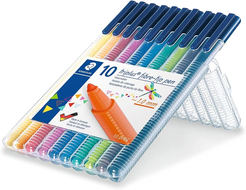 Further Details Title: STAEDTLER 323 Triplus Colour Fibre-Tip Pens, 1.0 mm, Assorted Colours, Pack of 10 Pack of 10 Standard Packaging Assorted Colours Condition: New Description: PRODUCT DESCRIPTION The Staedtler triplus colour fibre-tip pen has an ergonomic triangular shape for relaxed and easy writing and colouring. The fibre-tip pen is dry safe which means it can be left uncapped for days without drying up. The water based-ink washes out easily of most textiles. The fibre-tip pen has a linewidth of approximately 1 mm. It comes in a stand-up Staedtler box which makes it ideal for school and office use. SET CONTAINS: * The stand-up box contains 10 triplus color fibre-tip pens in assorted colours Age Level: 3 years and up Item Width: 1mm Brand: Staedtler Item Weight: 130g Color: Assorted Colours, Assorted Colours Release Date: 10/02/2006 Number of Items: 1 Dimensions: 0.17 x 0.12 x 0.01 cm; 130 Grams Ink/ Lead Colour: Assorted Item Length: 1mm Type: Fineliners Material: Plastic Line Size: 1.0 mm Style: Standard Packaging Pack of 10 Nib Type: Medium Size: Pack of 10, pack of 10 MPN: 323 SB10 ST Staedtler triplus colour fibre-tip pens in ergonomic triangular shape for relaxed and easy writing and colouring Dry safe - can be left uncapped for days without drying up 10 Staedtler triplus colour pens in assorted colours with a linewidth of approximately 1 mm Stable, pressure-resistant tip Water-based ink, washes out easily of most textiles Missing Information? Please contact us if any details are missing and where possible we will add the information to our listing.