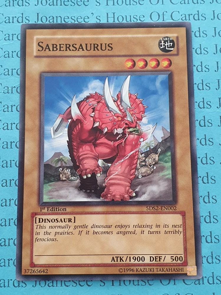 This is a Common Earth Dinosaur Sabersaurus 4 Stars ATK/1900 DEF/500 Card text: This normally gentle dinosaur enjoys relaxing in its nest in the prairies. If it becomes angered, it turns terribly ferocious. 5DS2 -EN002 1st Edition English Mint/NMint Condition Totally Original Konami (or your money back!) I will deliver in safe packaging to keep it in perfect condition. Ideal for players and collectors alike. Check out my other items! I will combine postage costs for multiple purchases. Sign up for my email newsletters by adding my eBay Shop to your favourites