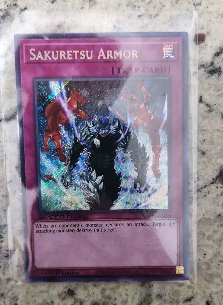 This Yu-Gi-Oh! TCG card, Sakuretsu Armor, is a Secret Rare 1st Edition card from the Speed Duel GX: Midterm Destruction set. The card features the character family of Yu-Gi-Oh! and is manufactured by Konami. It is a great addition to any collector's set and perfect for fans of the game. The card name, Sakuretsu Armor, is prominently displayed and it is sure to impress any Yu-Gi-Oh! enthusiast.