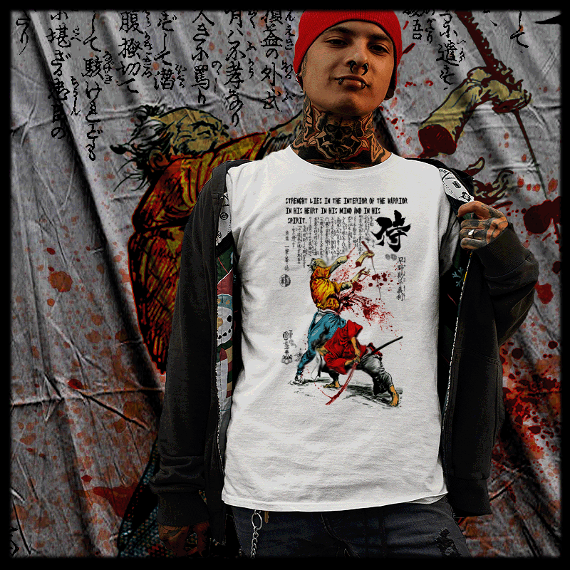 Fantastic, one of a kind, custom designed graphic samurai white T-shirt printed to order with the newest digital technology. The print won’t crack, won’t melt when put in the dryer, no rubbery texture. The print is embedded into the all cotton material. in case you would like this in a different color please send a message. The available colors are light blue, red, military green, dark gray, tan and light gray. T-shirt color options are based on the colors in artwork. Our shirts are always 100% cotton, sizes S to XL are soft cotton, similar to American Apparel shirts, our 2XL and 3XL shirts are heavier, sturdier shirts, also all cotton. Size 3X is only available in white. Our T-shirts are NOT pre-shrunk, therefore they may, like all cotton products, shrink a little when put in the dryer the first time. Never a whole size, just some. If you want to avoid that, please hang-dry after washing it. Shirts are true to size. Size charts can be looked up online: S to XL: Gildan Softstyle 4.5 Oz 64000 2XL, 3XL: Gildan Heavy Cotton 5.3 Oz 5000