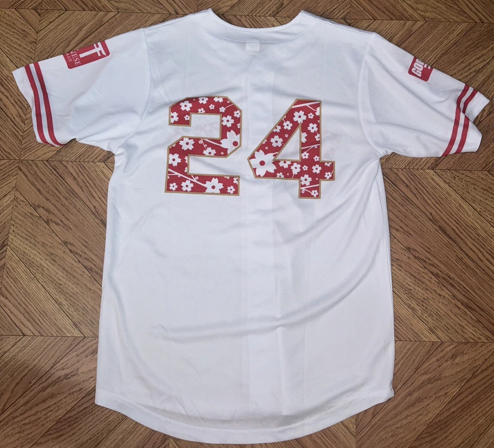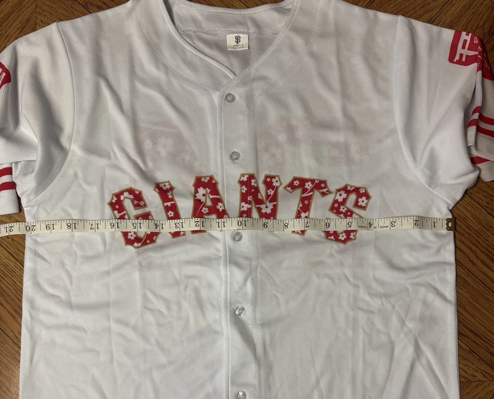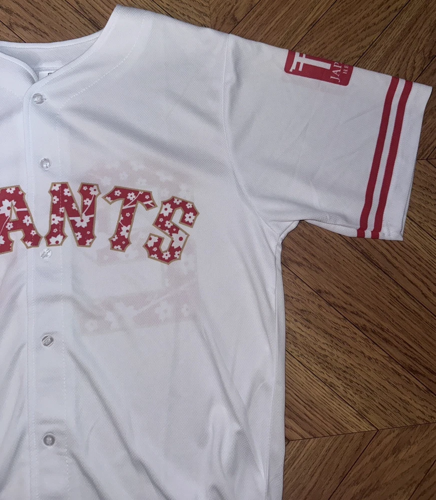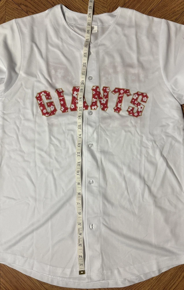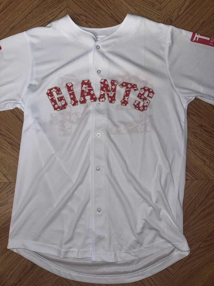 The product is a San Francisco Giants jersey featuring Japanese heritage and a Godzilla design, inspired by Masanori Murakami. Made in Japan, the white jersey in size S is a unique and collectible item for fans of the Major League Baseball team. It showcases a blend of Japanese culture and baseball, making it a special piece for supporters of the San Francisco Giants and fans of unique sports memorabilia.