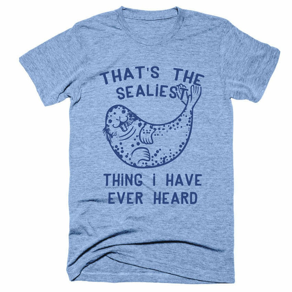 Thats The Sealiest Thing I Have Ever Heard T-Shirt [ QUALITY OF OUR T SHIRTS & INKS ] We use 100% ring-spun combed cotton, pre-shrunk durable t-shirts. Our heather-ed tees are a soft poly cotton blend for an even softer feel. With 2 extra inches in length and durable stitch side seams you will love the soft feel and look of a true vintage styled tee. Satisfaction Guaranteed! We use non toxic eco friendly water based inks that are cured with forced air technology. Our inks have a soft hand feel to the touch. Every Tee is professionally hand screen printed through, high mesh aluminum screens for clear vibrant images. No cheap iron transfers here. [ MEN'S SIZE MEASUREMENTS] See Chart Our Mens / Unisex run True to size. The size you normally wear should fit nicely. For Womens tee's, If you are between sizes or prefer a little more room we recommend ordering one size up. Please refer to the size chart photo above for tee specification. [ SHIPPING & HANDLING ] * Orders ship out Fast within 1-3 business days * We ship everywhere! Thank you for shopping with us. If there is anything you need help with regarding color, sizes, or wholesale info please do not hesitate to contact us. Check out our shop announcements for special offers and promotions.