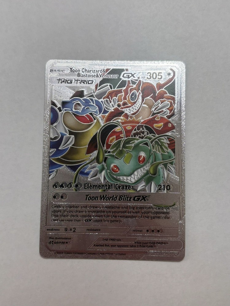 Get your hands on this exclusive silver foil card collection featuring Charizard & Blastoise and Venusaur GX! This full art display card game piece is perfect for collectors and fans alike, boasting 210 attack power and 300 HP. The card is suitable for ages 6 and up and is a rarity that any avid card game player would love to have. The card is colorless with a foil finish and is near mint or better condition. It is a speciality GX card that will add value to any collection. Don't miss out on the chance to own this coveted card game piece!